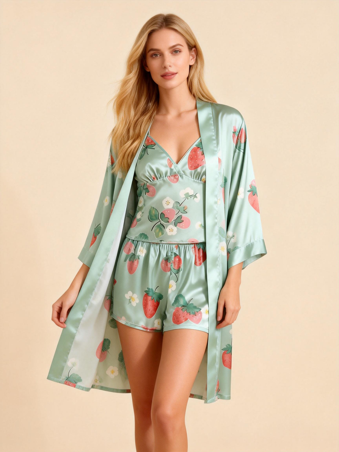 Elegant Satin Loungewear Trio with Juicy Strawberry Print