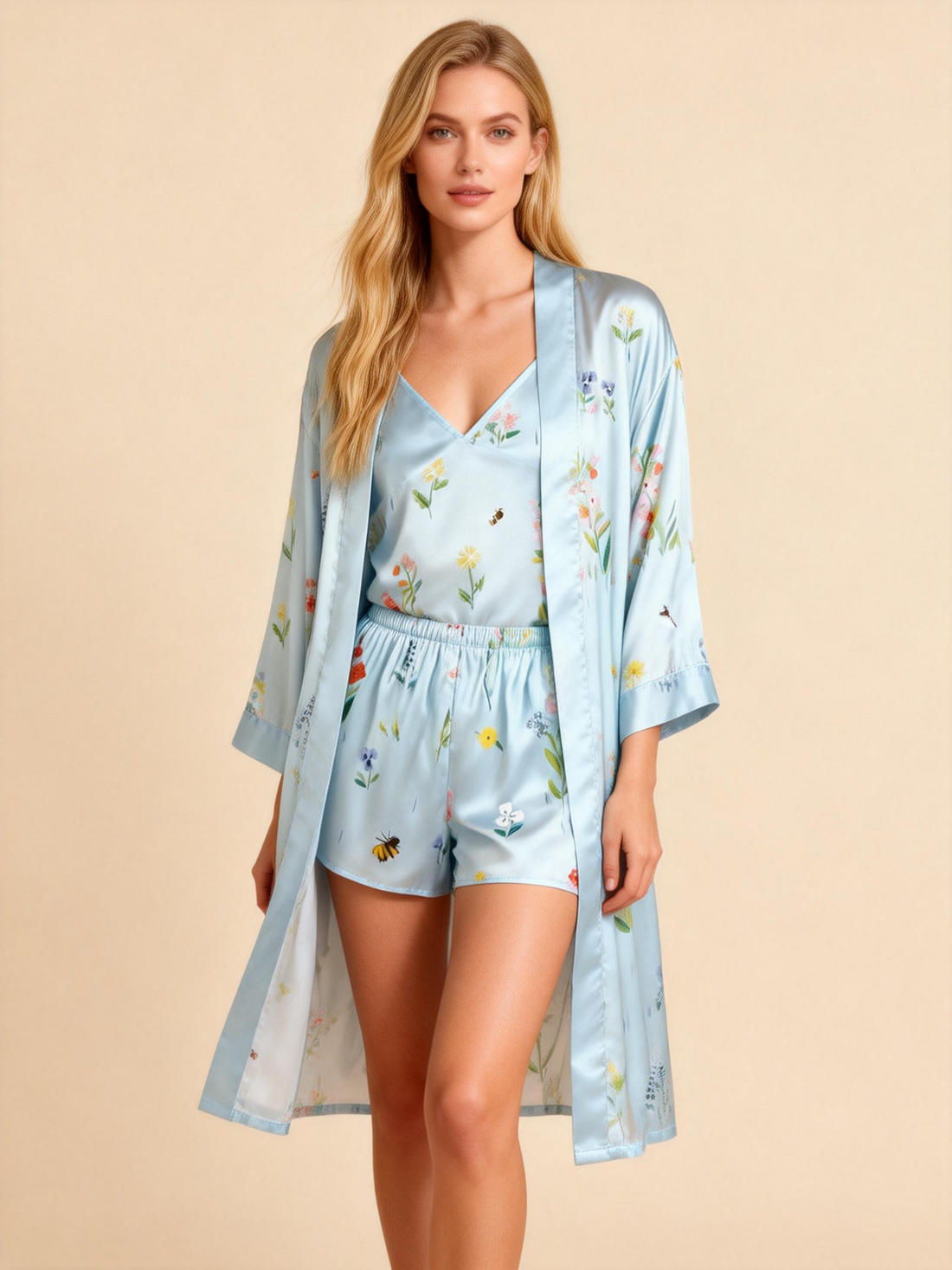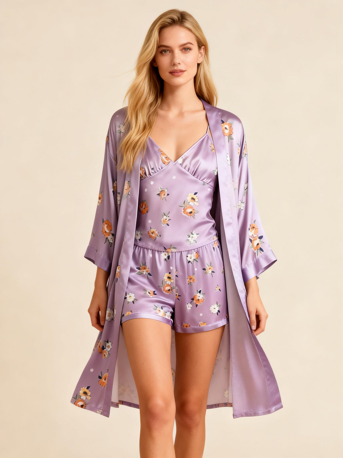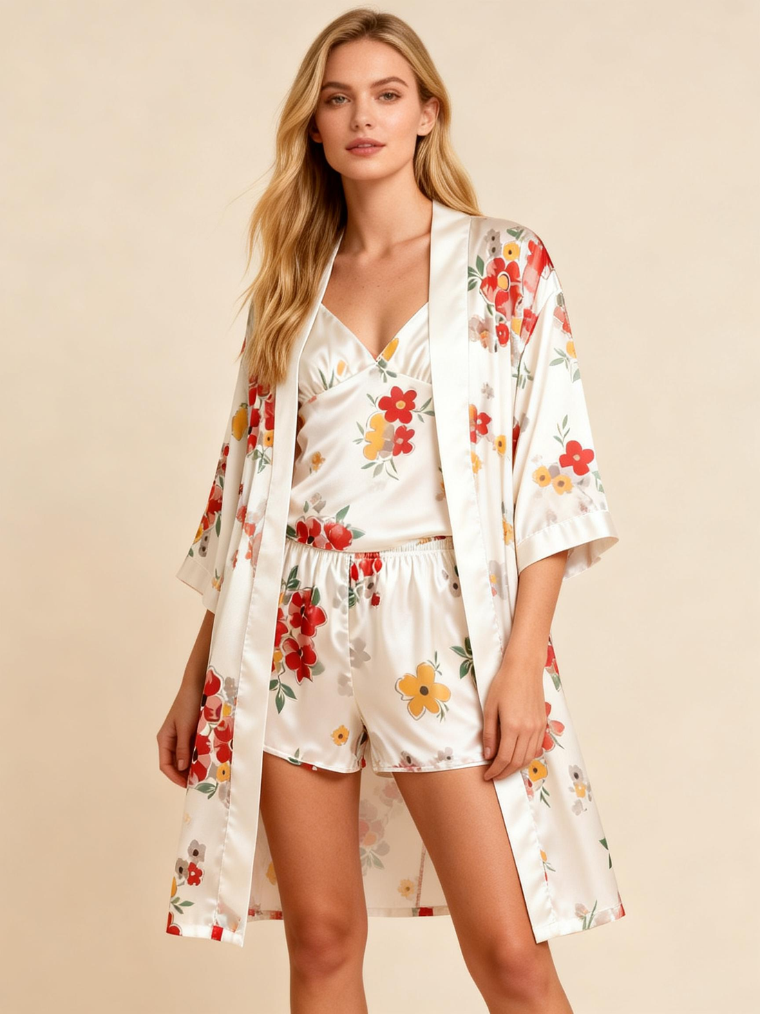 3-Piece Satin Pajama Set – Flower Print Robe, Camisole & Shorts