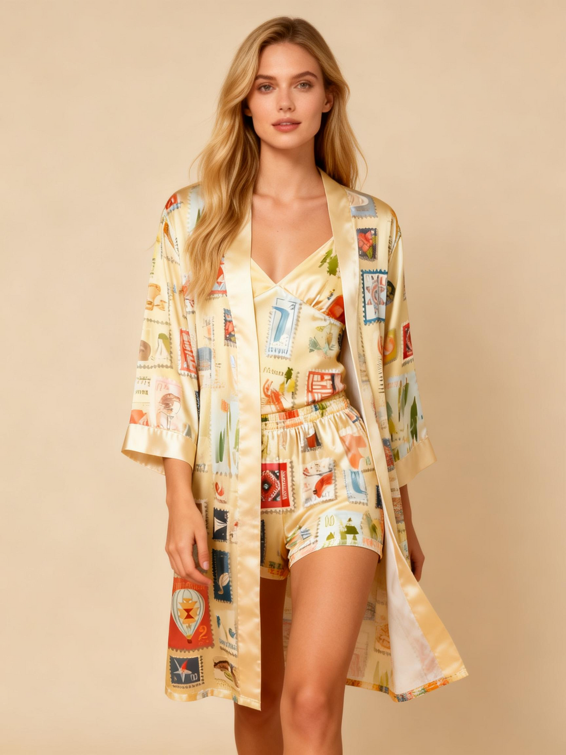 Elegant Satin Loungewear Trio with Vintage Stamp Motif