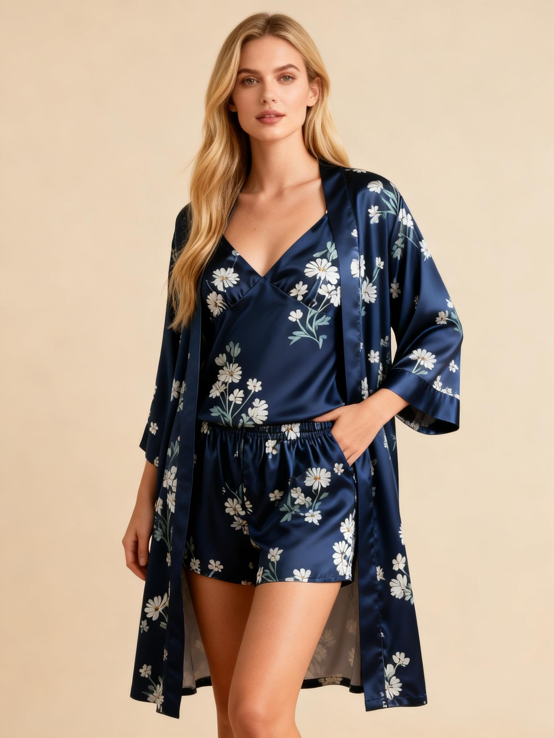 Elegant Satin Navy Loungewear Trio with Daisy Floral