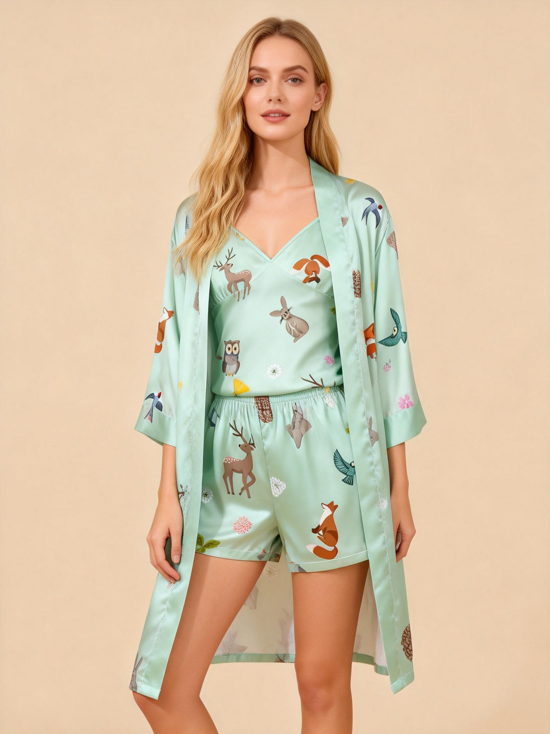 Elegant Satin Loungewear Trio with Adorable Animal Motifs