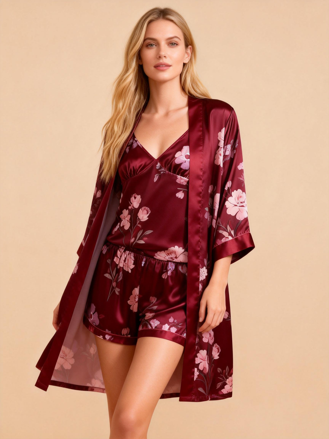 Floral Satin 3-Piece Sleepwear Set for Women – Robe, Camisole & Shorts