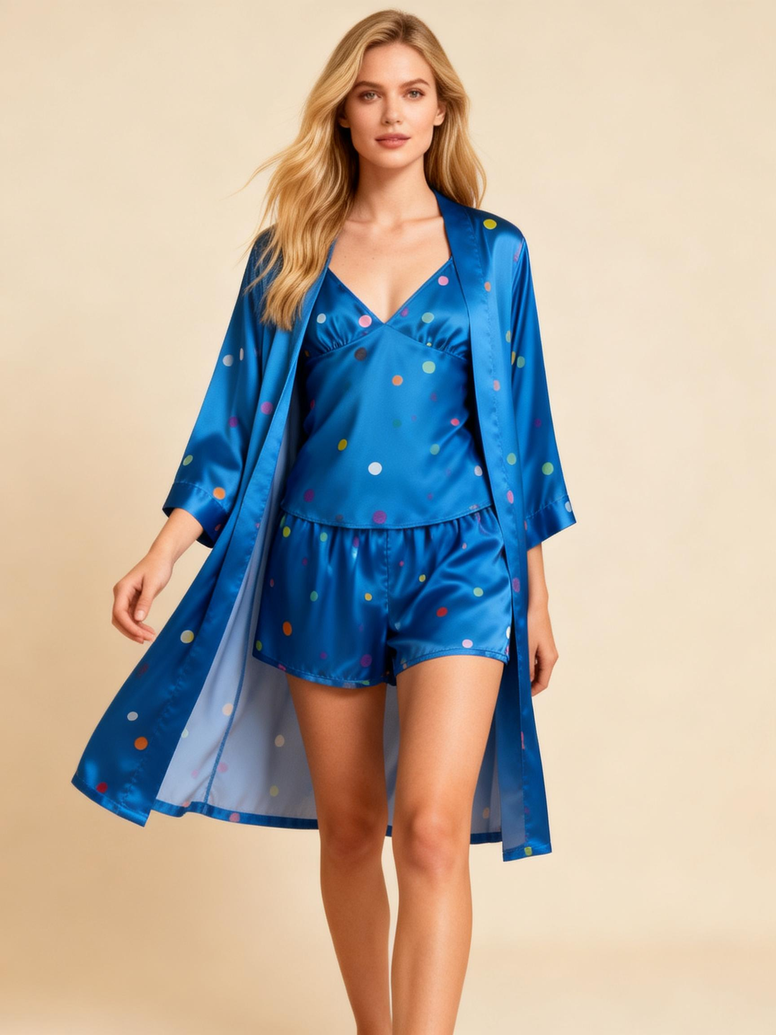 Elegant Satin Blue Loungewear Trio with Colorful Polka Dots