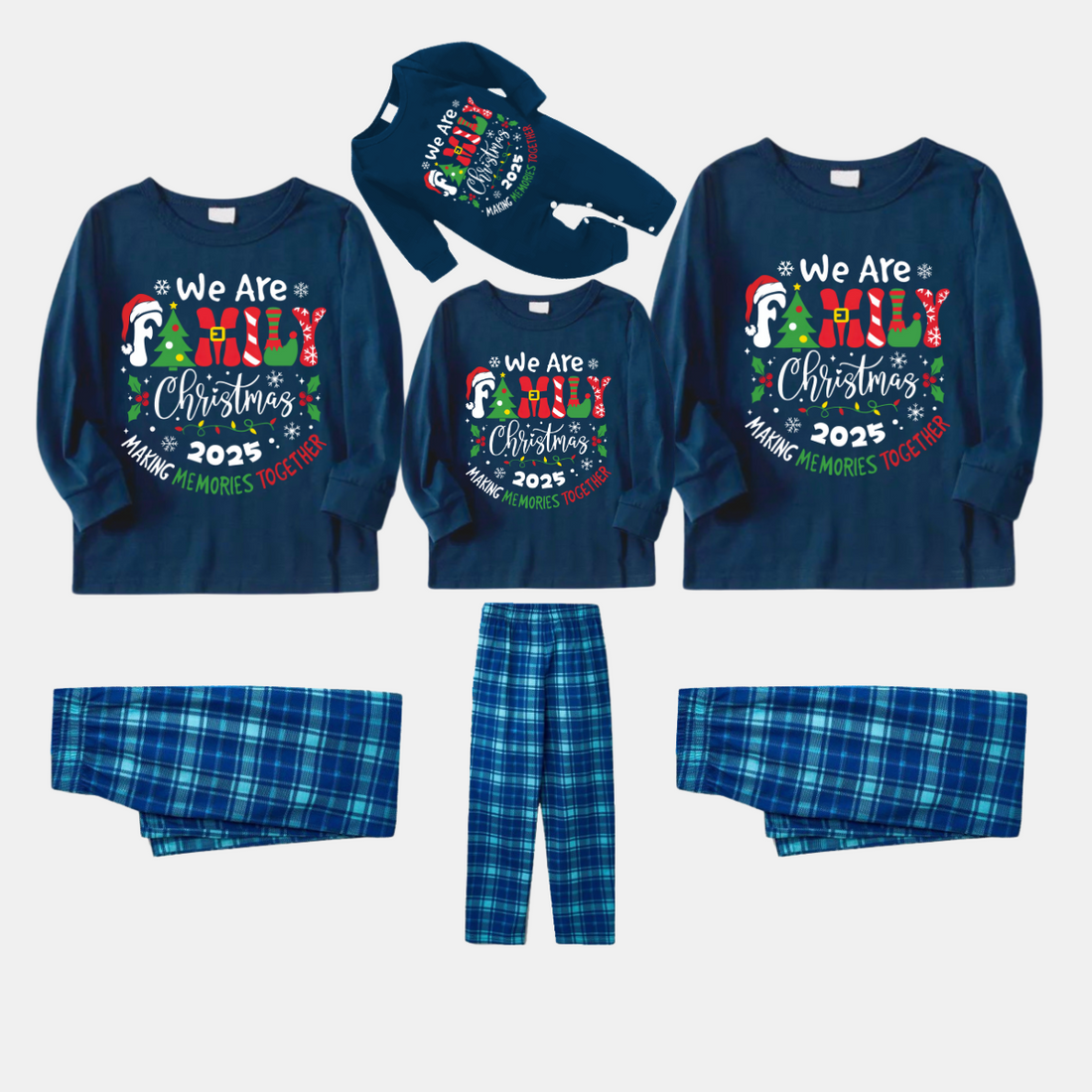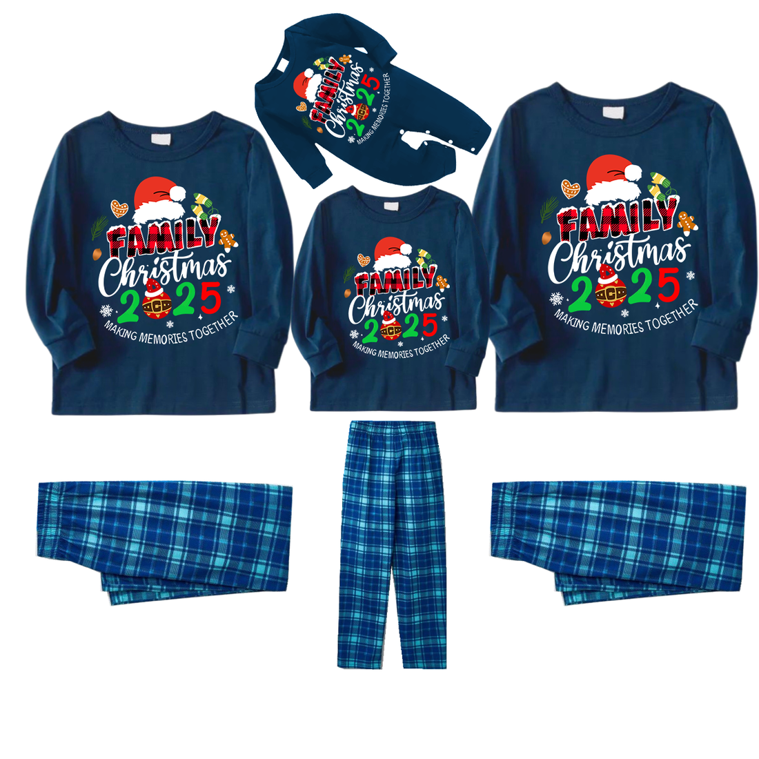 "MAKING MEMORIES TOGETHER FAMILY CHRISTMAS 2025" Text Pattern - Blue Long Sleeve Top With Blue Plaid Family Matching Pajamas
