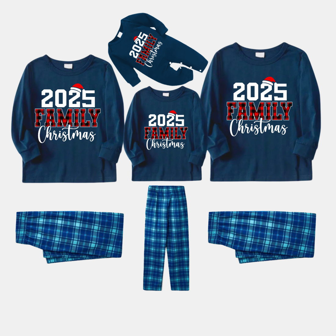 "Family Christmas 2025" Text and Santa Hat Prints Blue Long Sleeves Top with Red and Blue Plaid Pants Christmas Matching Pajamas