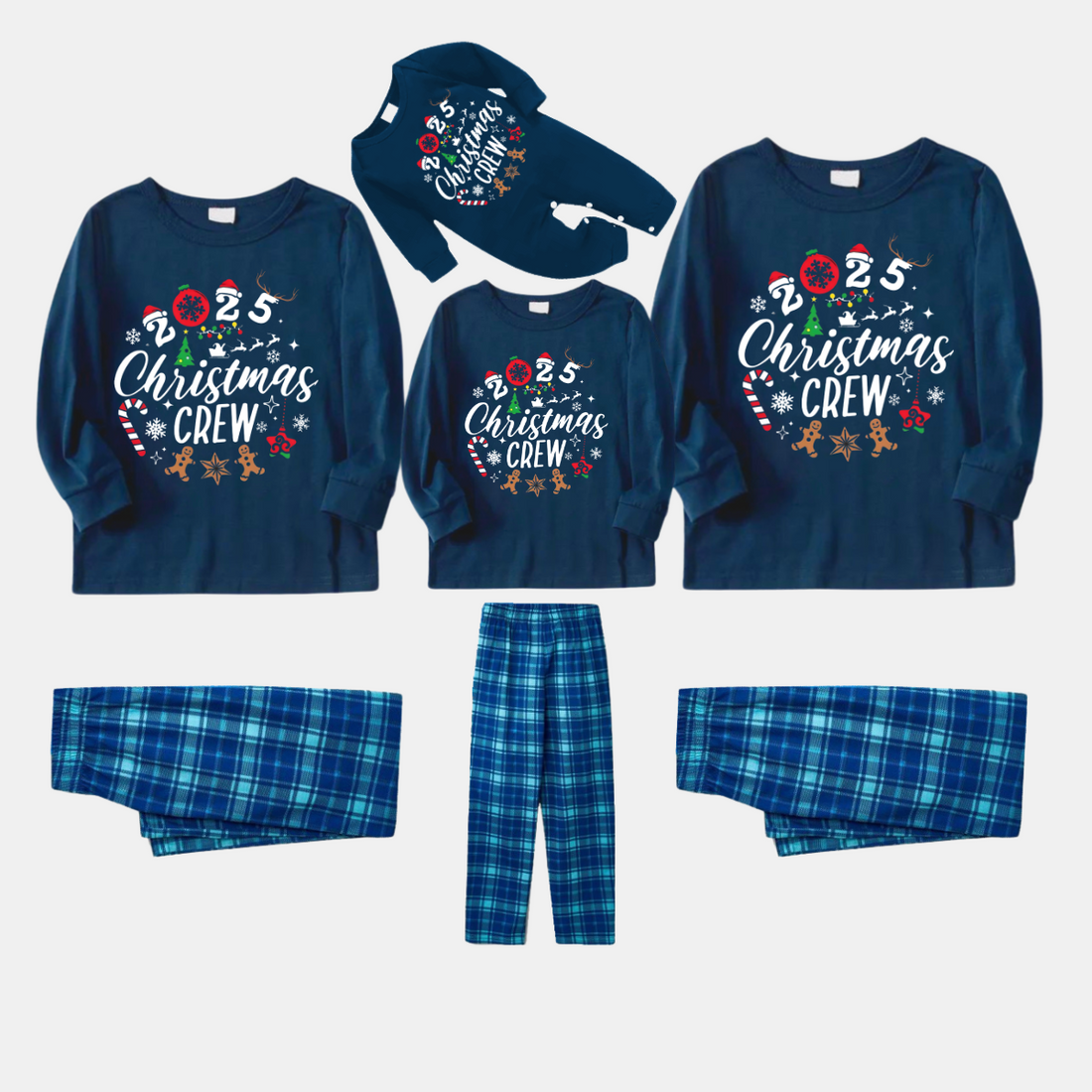 "2025 Christmas Crew" Text and Christmas Pattern Printed Blue and White Plaid Family Matching Pajamas