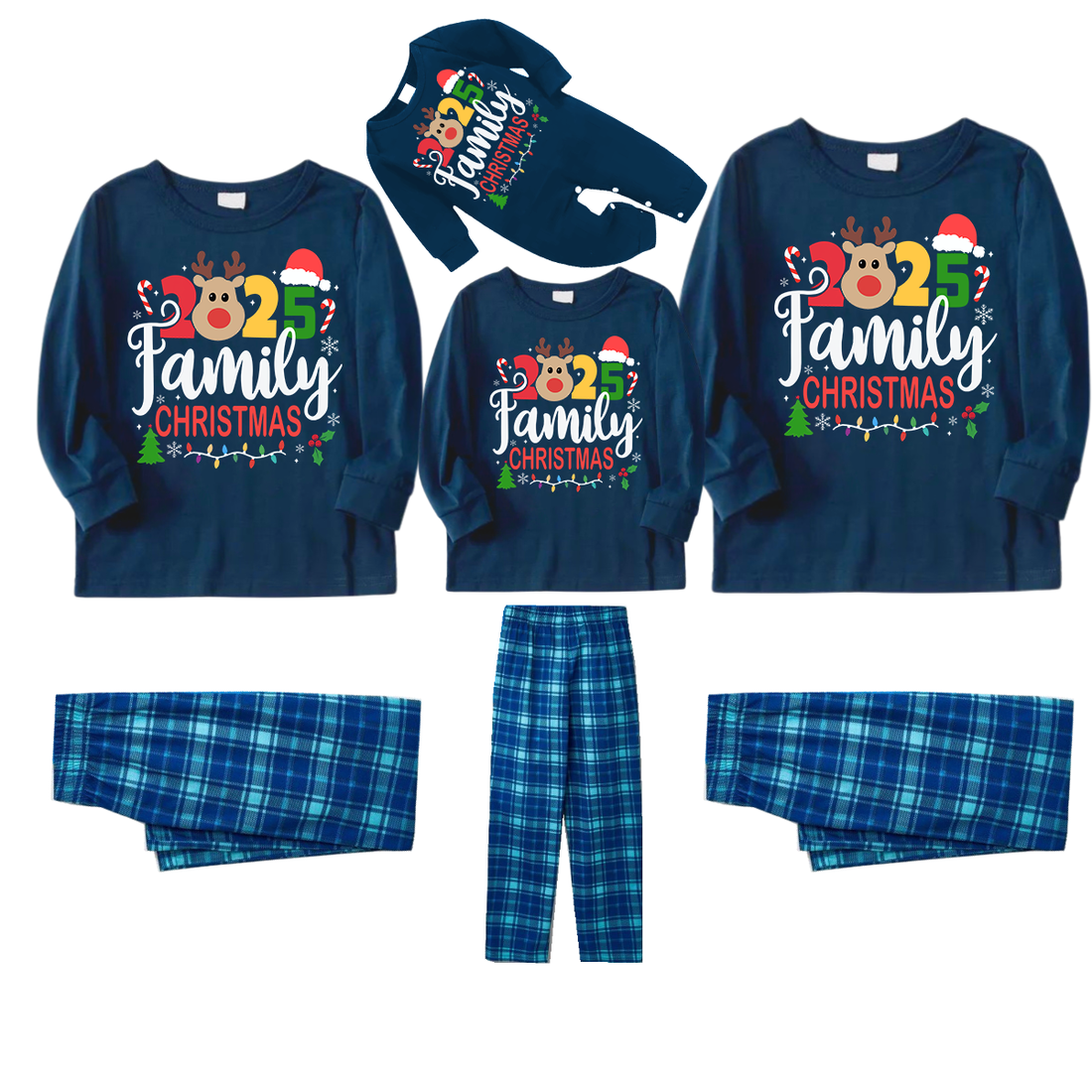 "Family Christmas 2025" Text and Deer Prints Blue Long Sleeve Top With Blue Plaid Family Matching Pajamas
