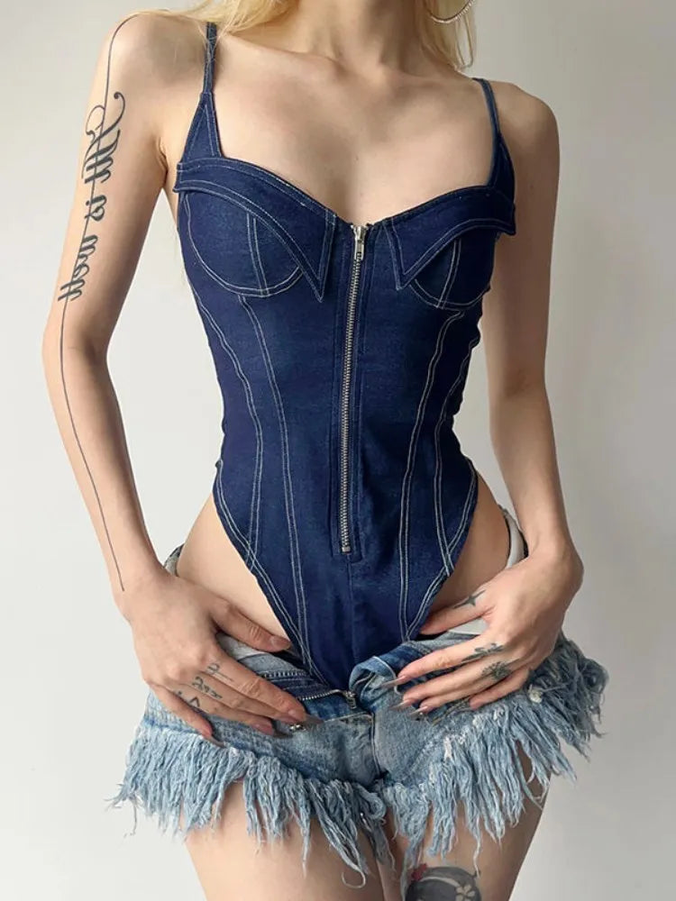 Summer Vintage Sleeveless Denim Spaghetti Strap Bodysuits