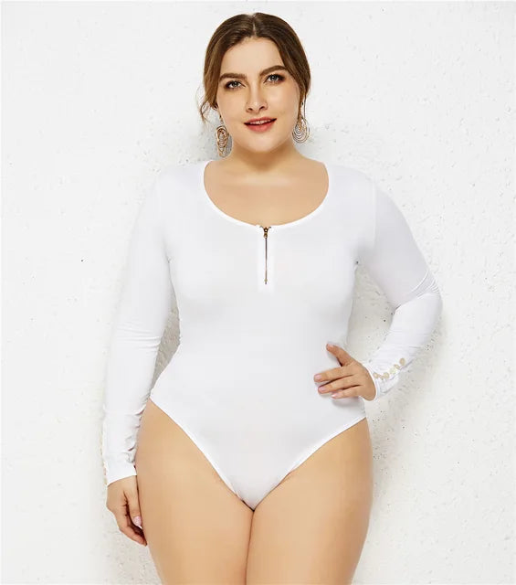 Plus Size Long Sleeve White Bodysuit Zipper V-Neck