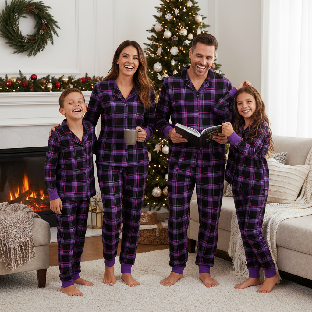Christmas Purple Plaid Button-Front Pajamas Family Pajamas Sets