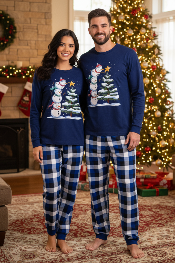 Couple Blue Plaid Pajamas Set with Snowman & Christmas Tree Print