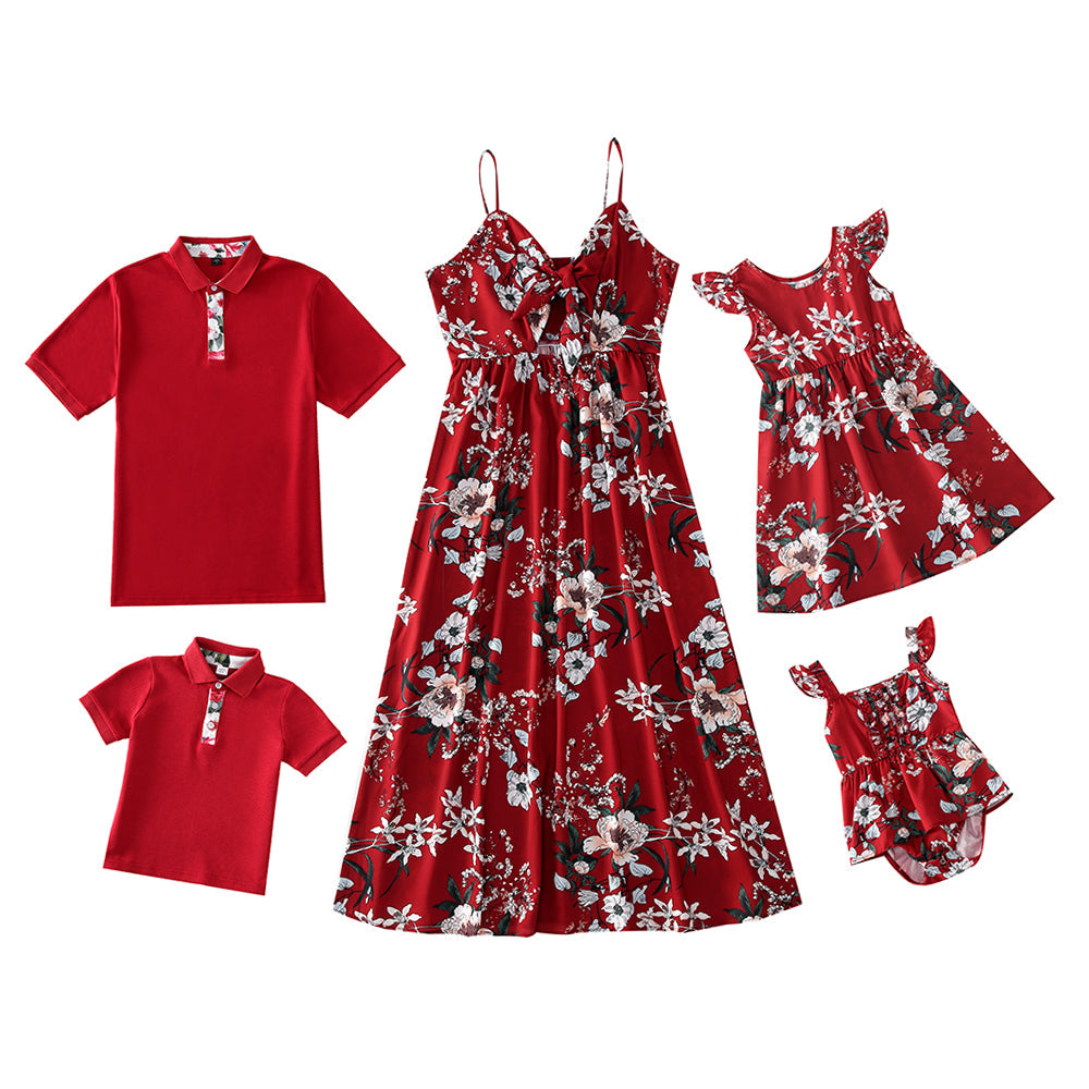Family Matching Outfit Red Floral Print Dresses and T-shirts Matching Sets