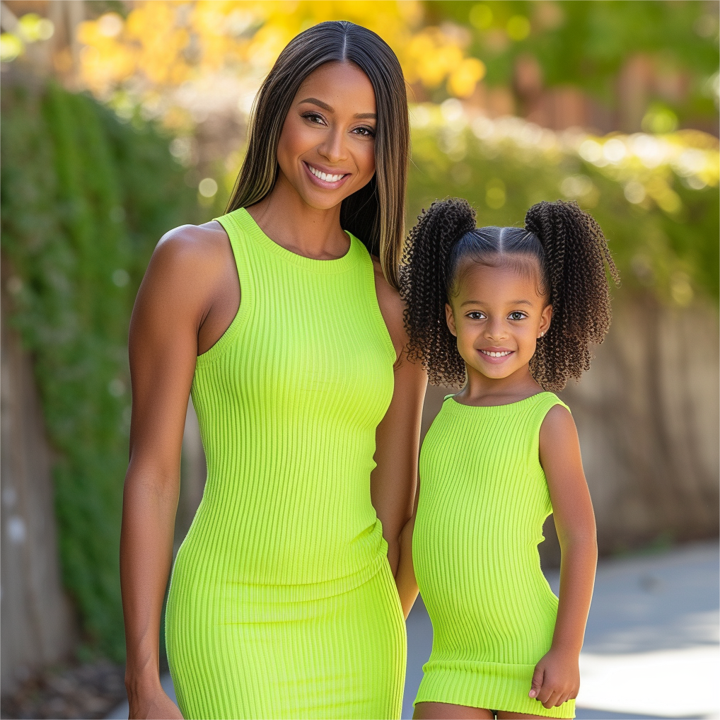 Mom and Daughter Matching Lime Green Bodycon Sleeveless Rib-knit Dress
