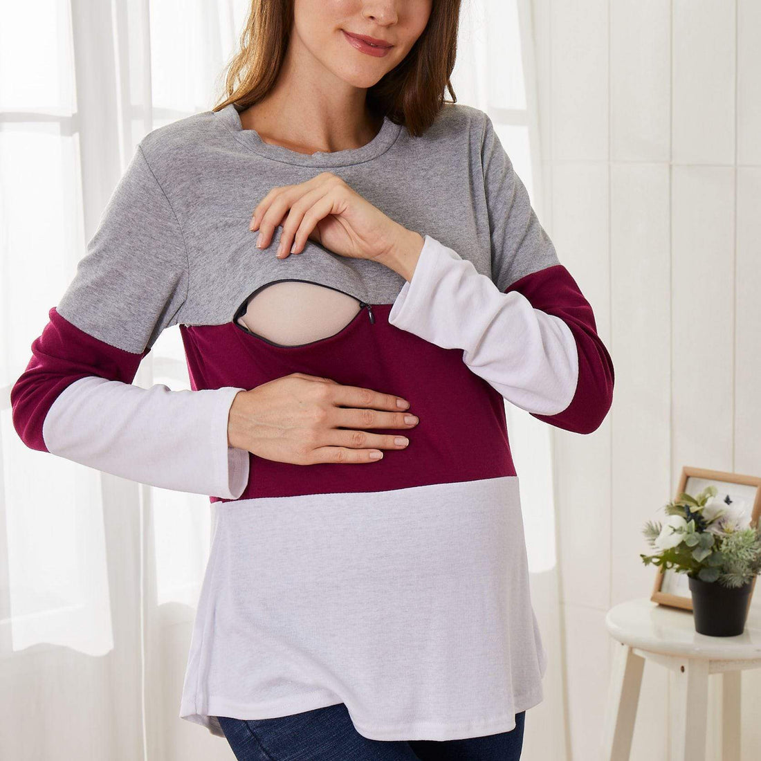 Casual Color Blocked Long-sleeve Nursing Top