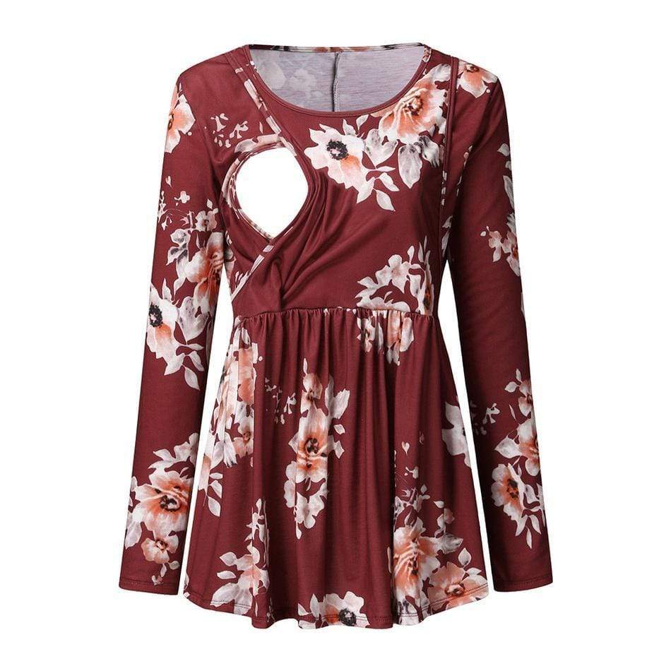 Fashionable Floral Print Round Neck Long-sleeve Nursing Tee