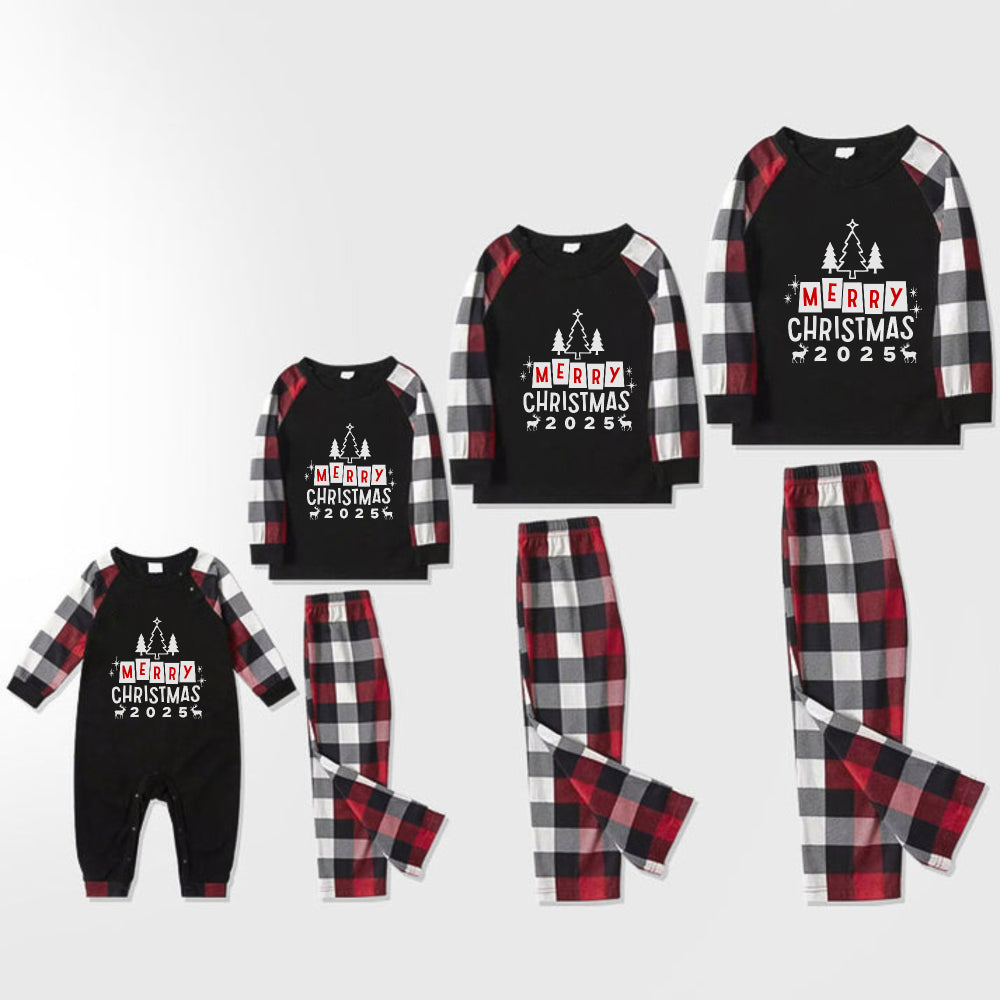 "2025 Family Christmas" Letter Print Red & Black & Grey & White Plaid Family Matching Pajamas