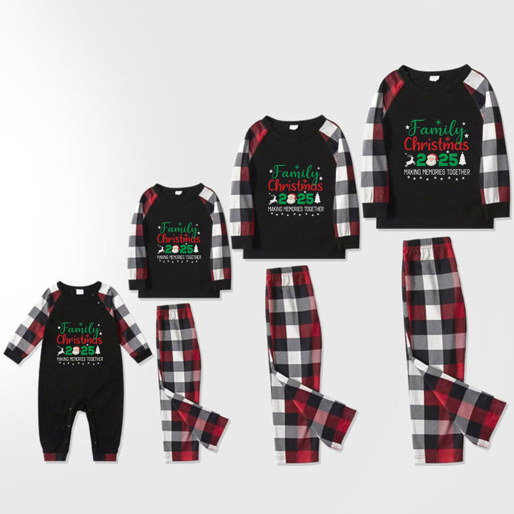 "FAMILY 2025CHRISTMAS MAKING MEMORIES TOGETHER " Text And Santa Hat Printed Pattern- Black Top with Red&Black&White Plaid Sleeves - Family Matching Pajamas