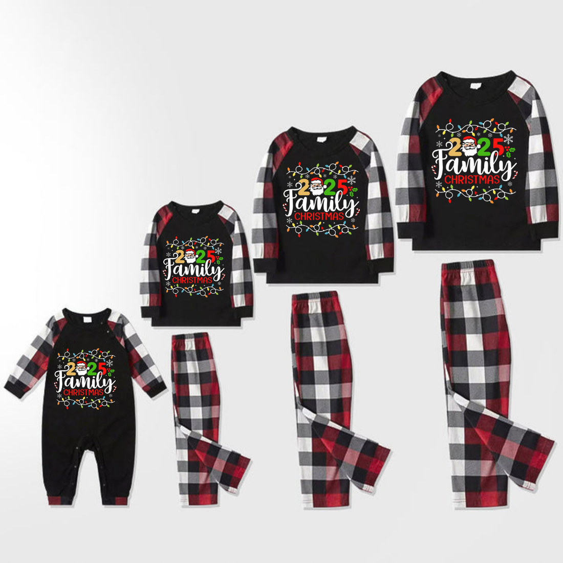 Santa Hat And "Family Christmas 2025 " Colorful Text Printed Pattern - Black Top with Red&Black&White Plaid Sleeves - Family Matching Pajamas