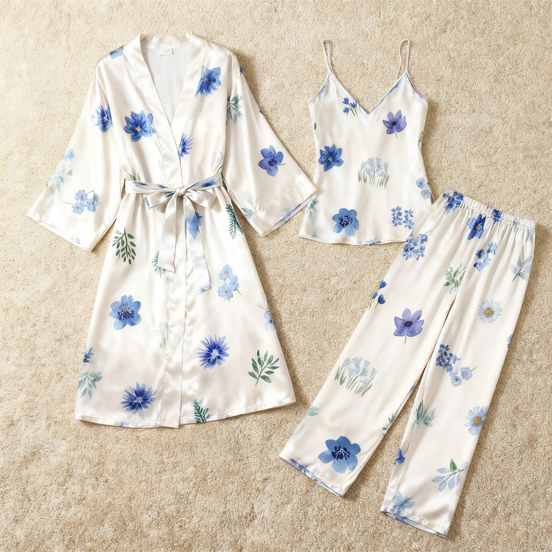 Silky Satin 3-Piece Nightwear Set with Blue Florals Design