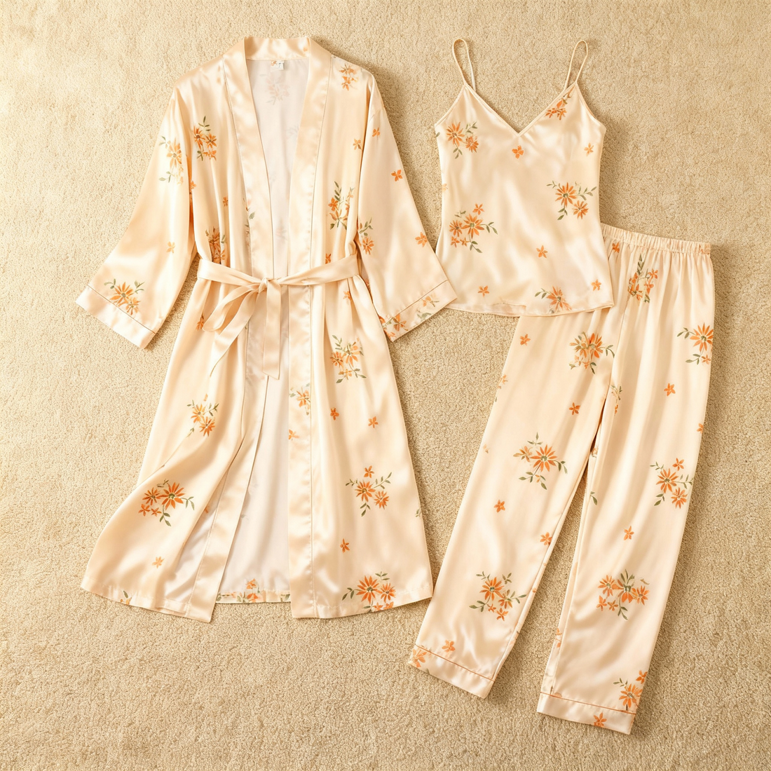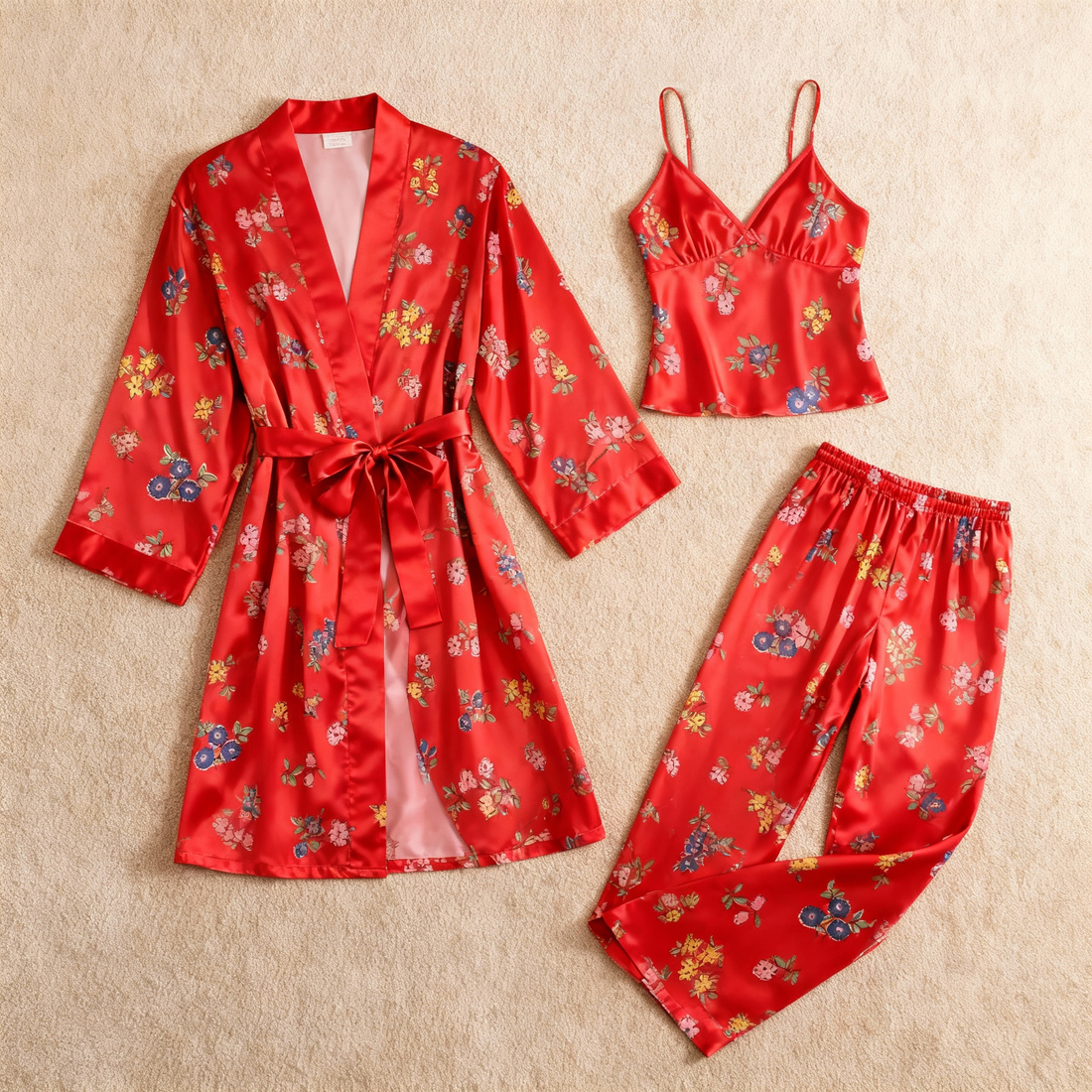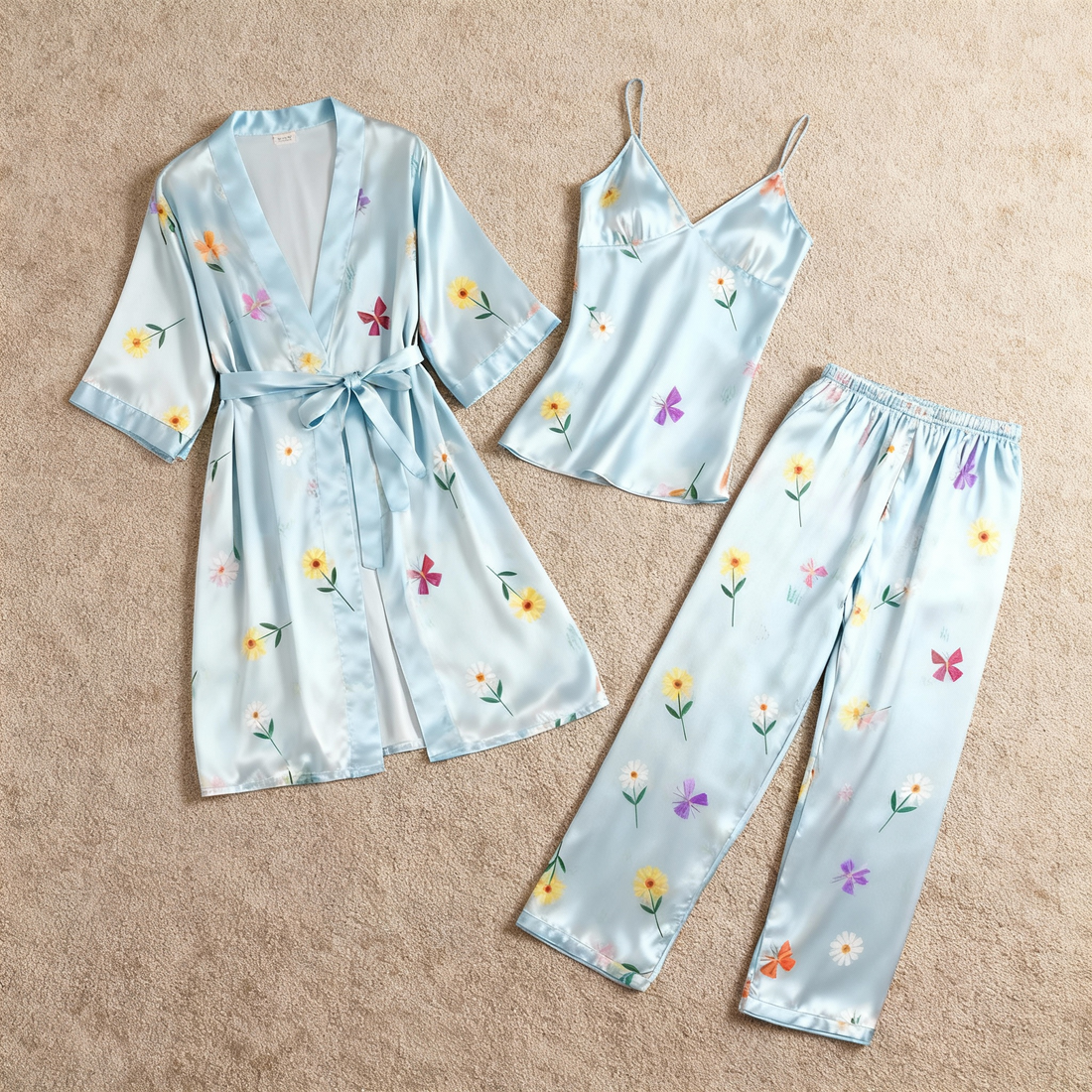 Women's Luxury Satin Pajama Set – 3-Piece Flower Design Robe