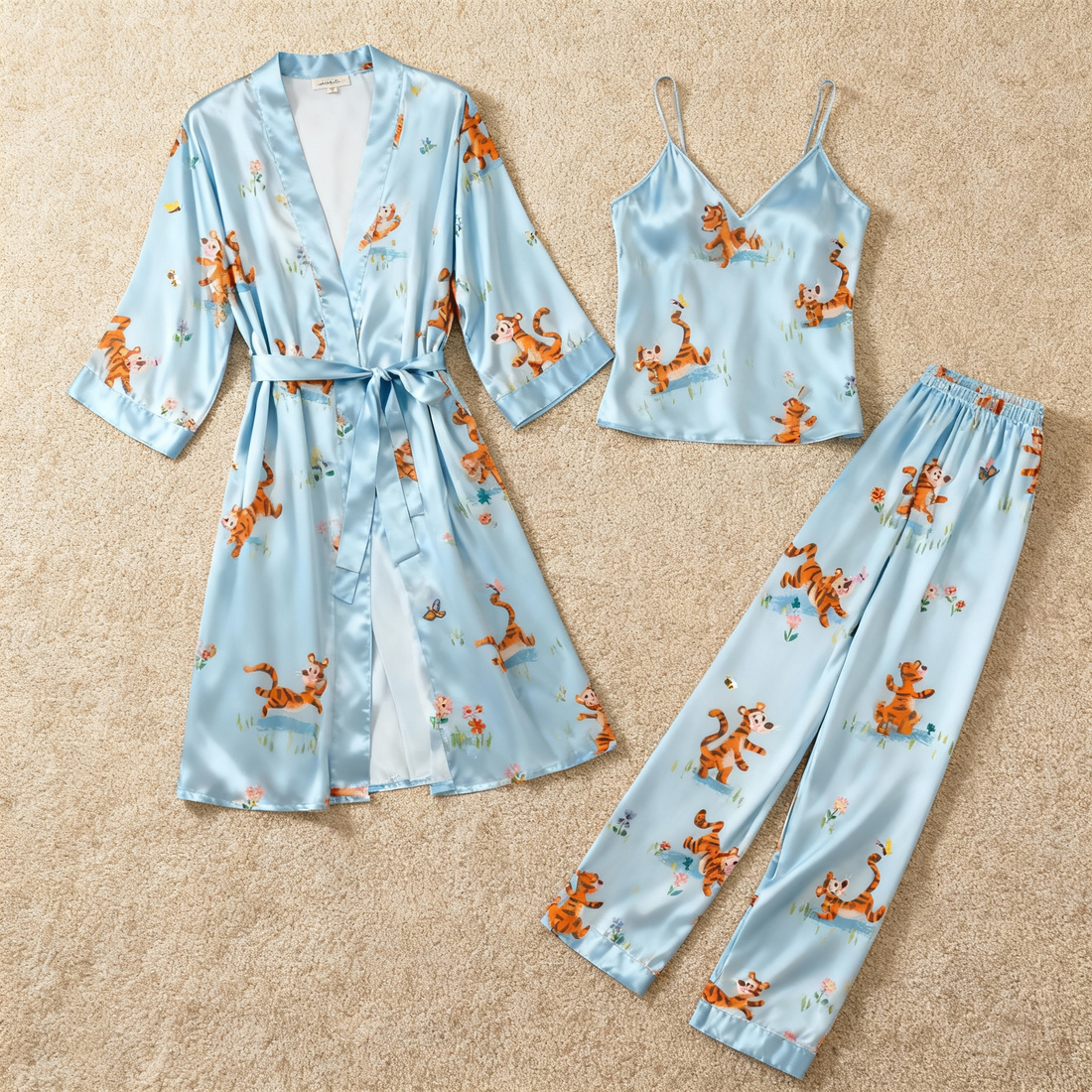 Silky Satin 3-Piece Pale Blue Nightwear Set with Playful Animal Design