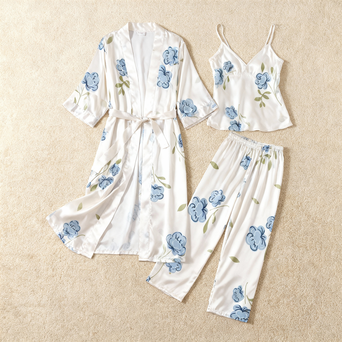 Women's Satin Sleepwear Set – 3-Piece Flower Print Pajamas with Robe & Pants