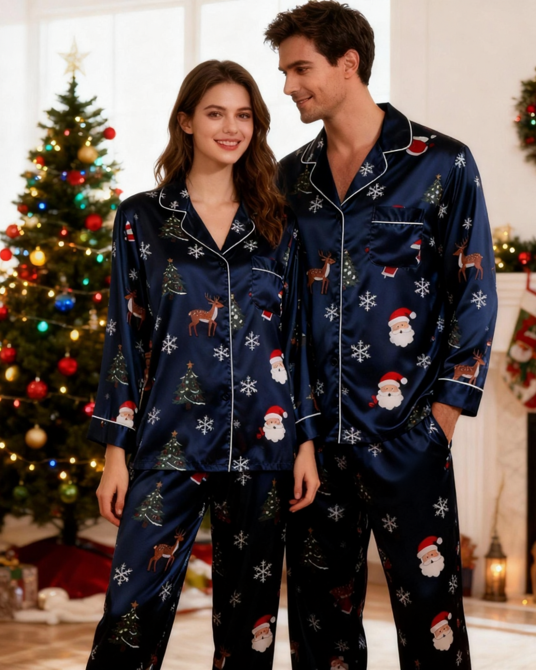 Holiday Couple Santa Claus Button-Up Satin Christmas Pajamas Set