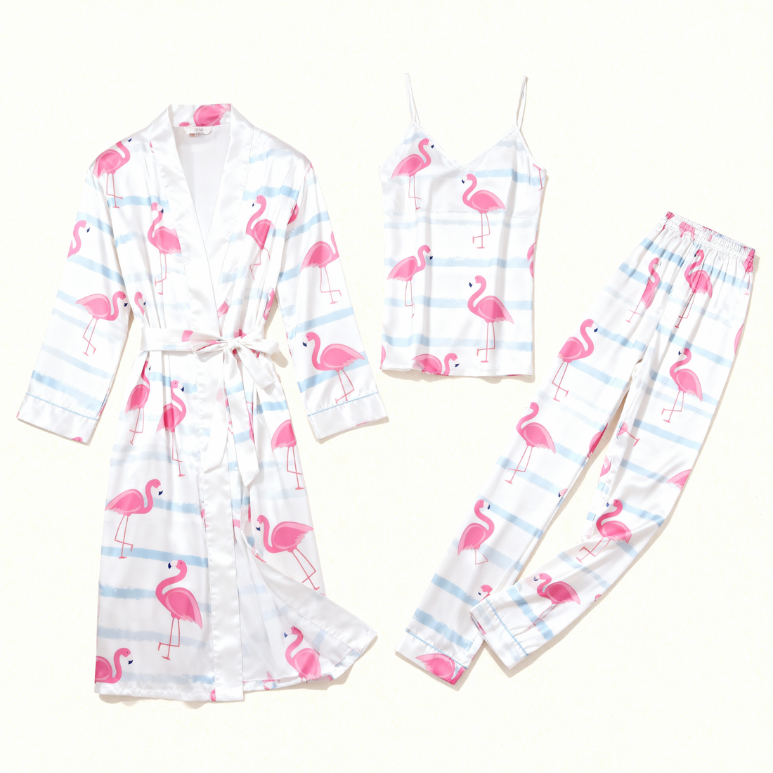 Women’s Luxury Nightwear – Satin Robe, Cami, Pants with Flamingo Pattern