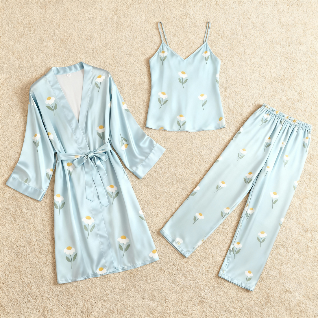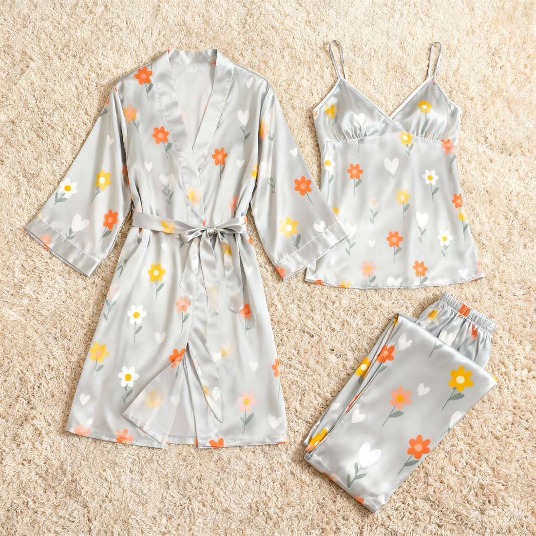 Women’s Satin 3-Piece Loungewear Set in Soft Florals Style
