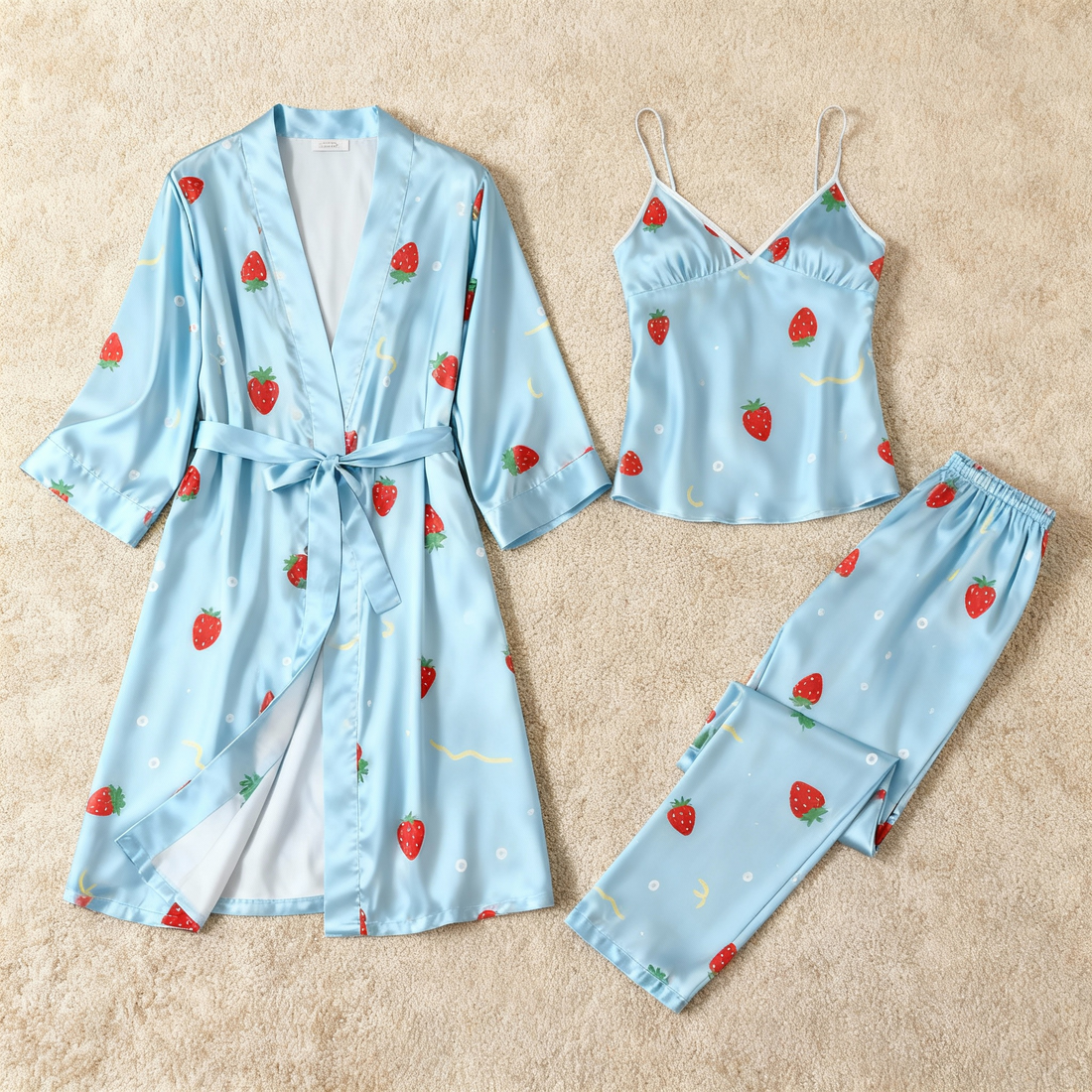 Premium Sky-Blue Satin Nightwear Trio With Sweet Strawberry Print