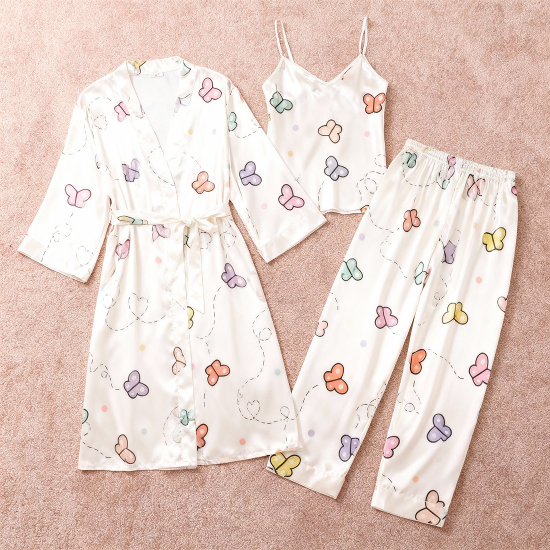 Premium Satin Nightwear Trio With Colorful Butterflies Motif