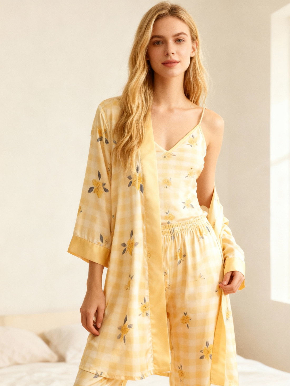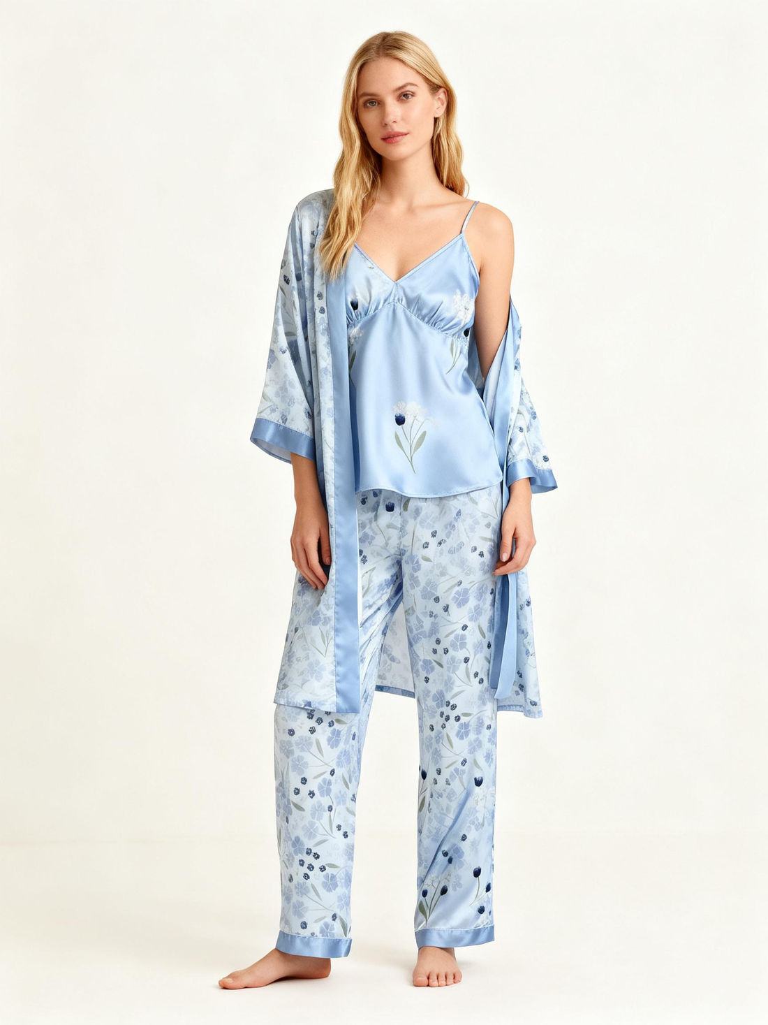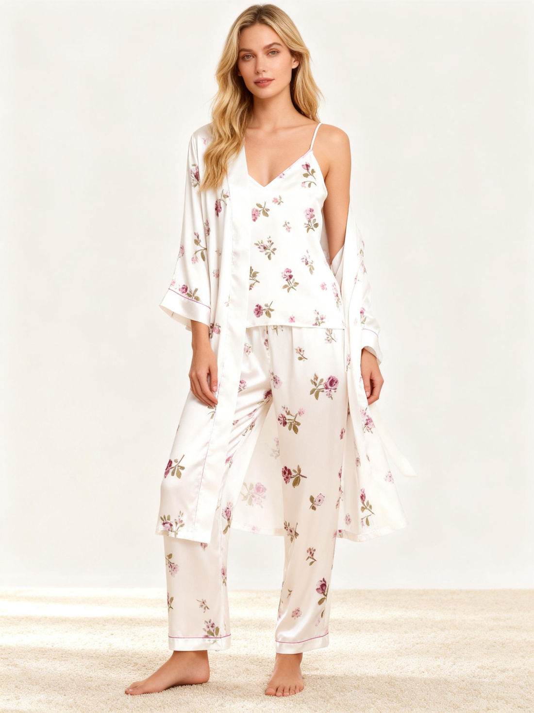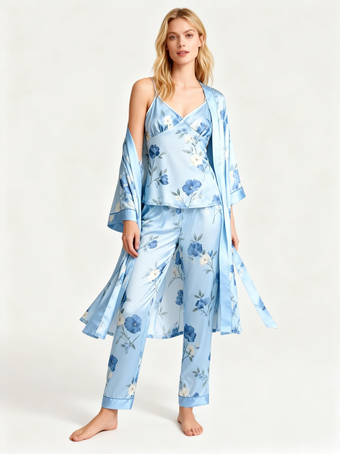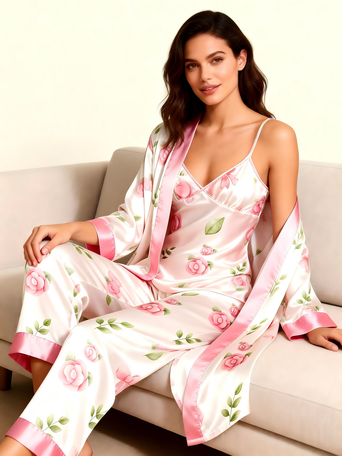 Women's Satin Sleepwear Set – 3-Piece Flower Print Pajamas with Robe & Pants