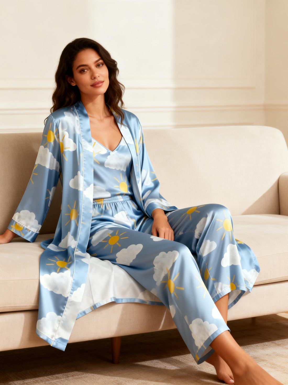 Women’s 3-Piece Sun & Clouds Print Satin Sleep Pajama Set