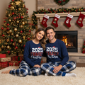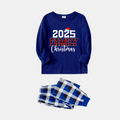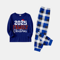 Couple Matching Blue Plaid Pajamas With "2025 Family Christmas" Text Printed