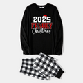 2025 Family Christmas Text Print Black Long Sleeve Top with Black And White Plaid Pants Family Matching Pajamas