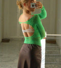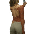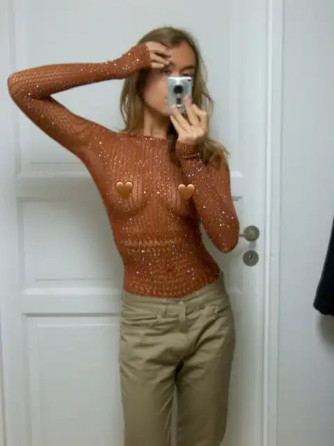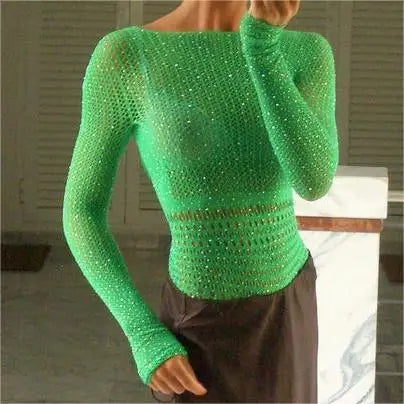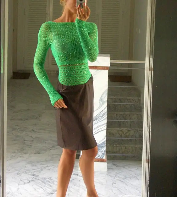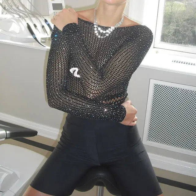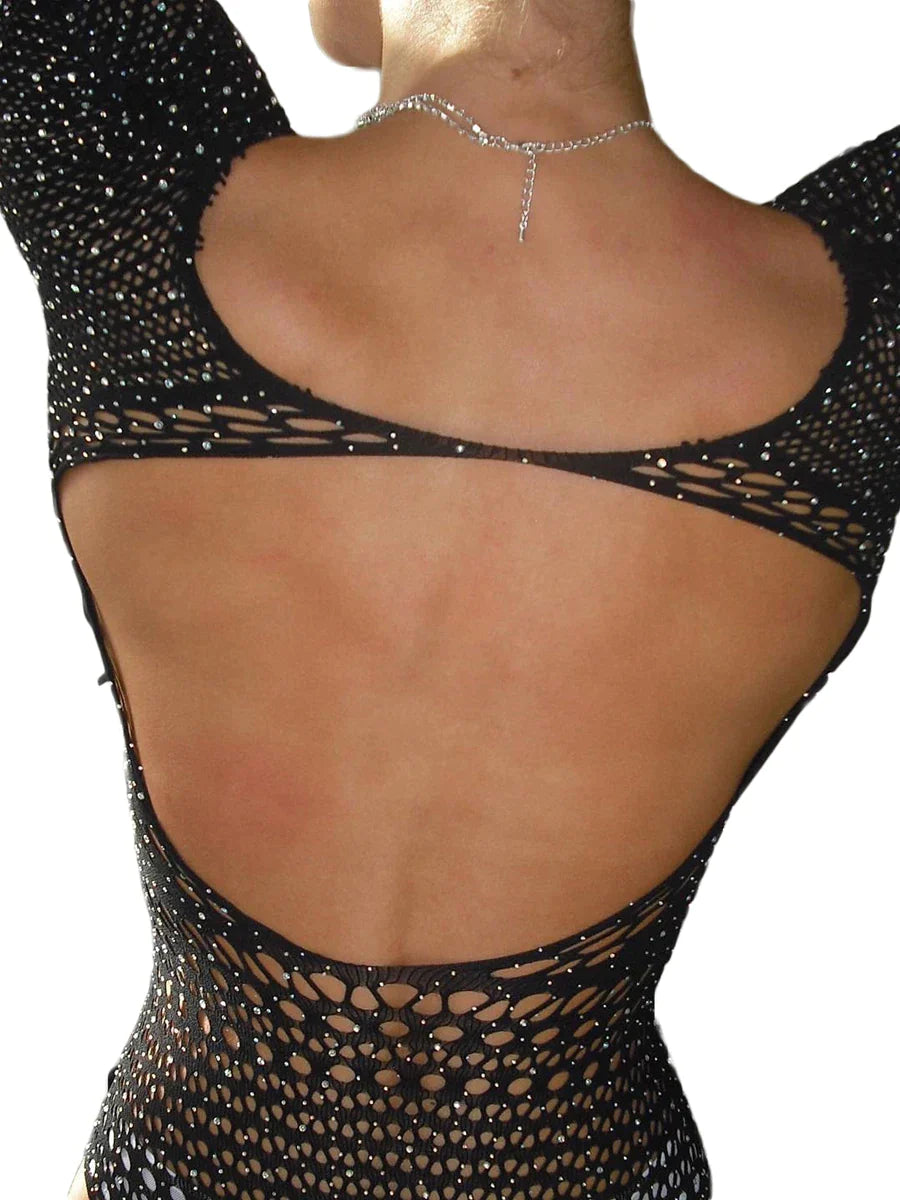 Women's Mesh Long Sleeve See Through Rhineston Bodysuit