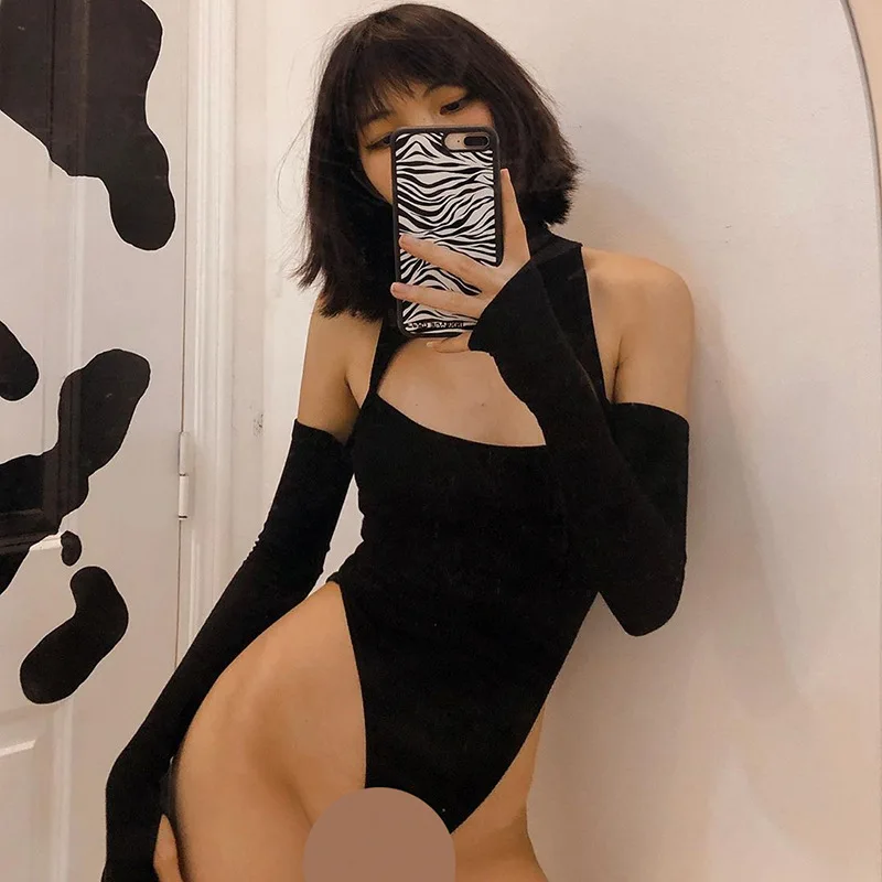 Hollow Out Off Shoulder Long Sleeve Black Bodysuit