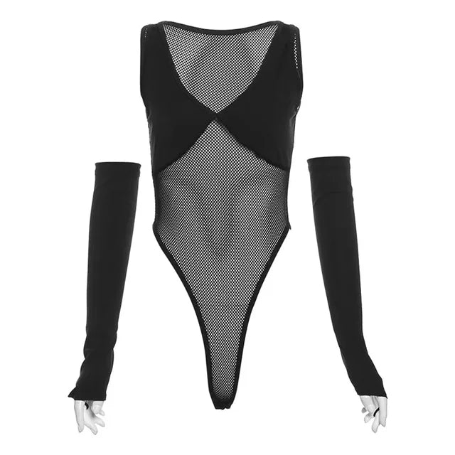 The combination of the mesh fabric and patchwork detailing creates a visually striking and attention-grabbing ensemble that is sure to turn heads. Whether worn as a standalone statement piece or layered with other items for a more subtle effect, this bodysuit is a bold choice for those who want to make a fashion statement.