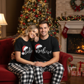 Believe Couple Christmas Pajamas Set - Black Top Black and White Plaid Pants White Text Graphic