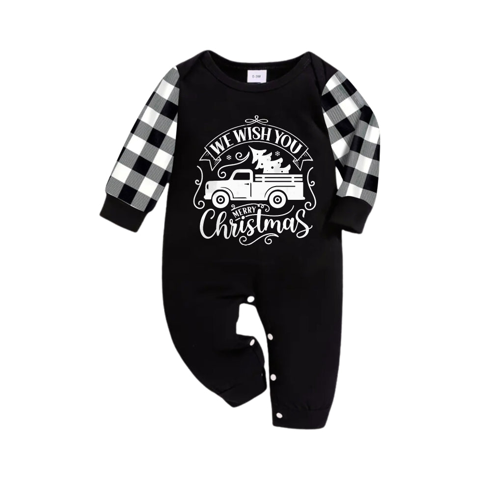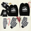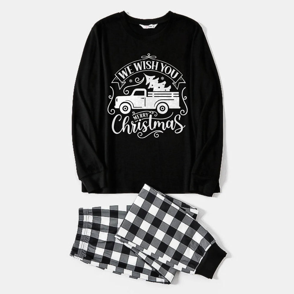 Black and White Plaid Christmas Pajamas Set With Car and "We Wish You A Merry Christmas" Text Print