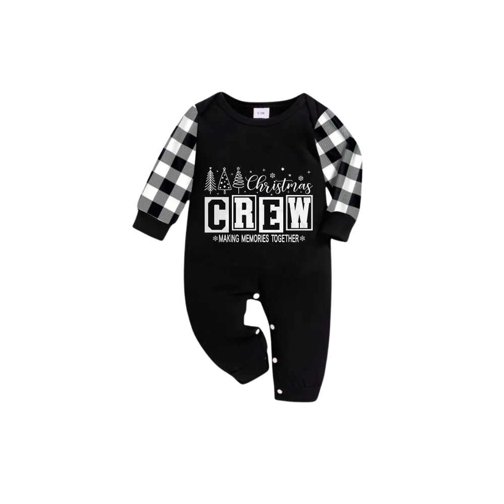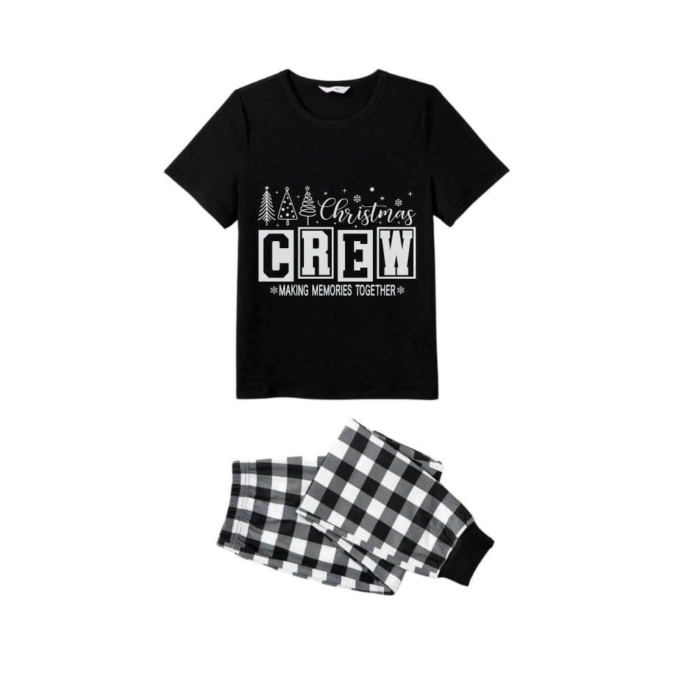Black and White Plaid Short Sleeve Christmas Family Pajamas Set With "Christmas Crew Making Memories Together" Print