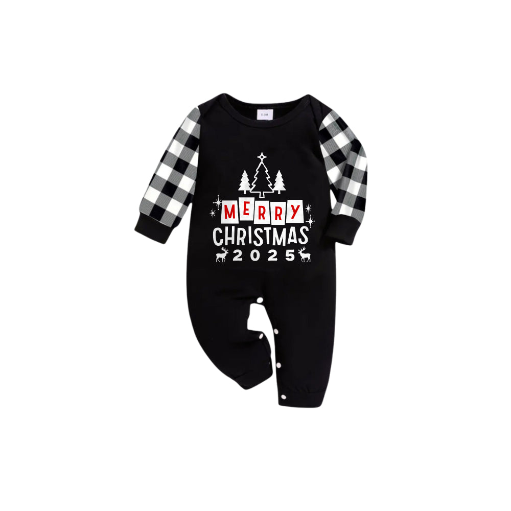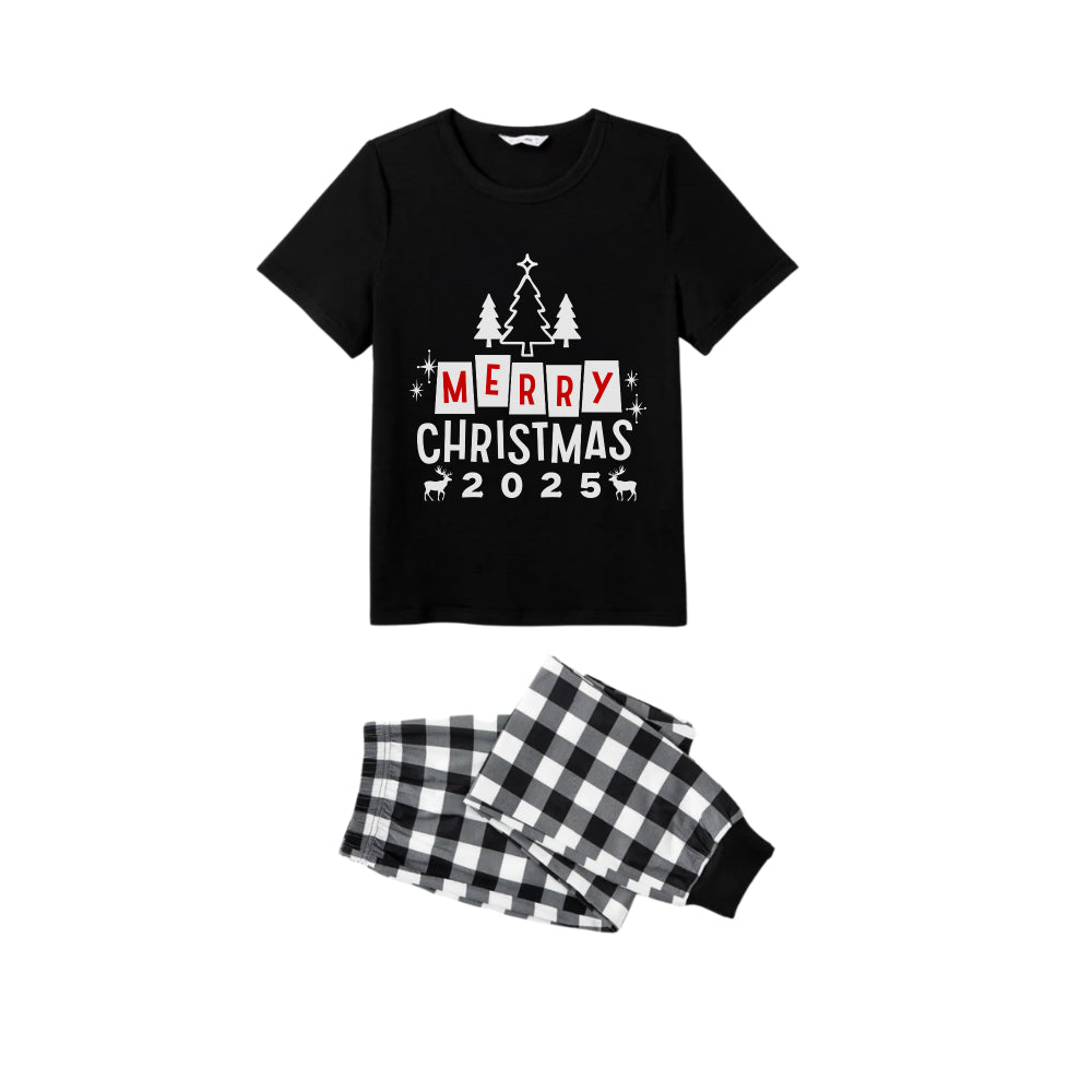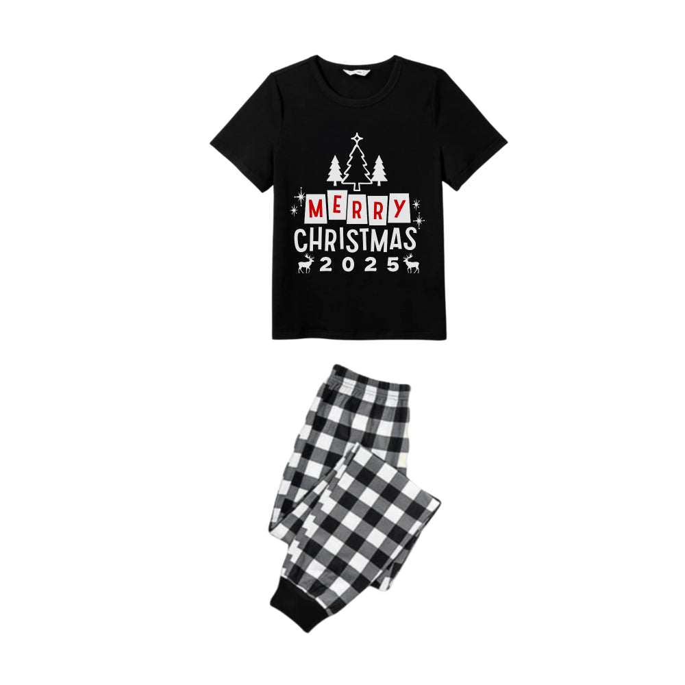 Black and White Plaid Short Sleeve Christmas Family Pajamas Set With "Merry Christmas 2025" and Christmas Tree Print