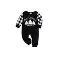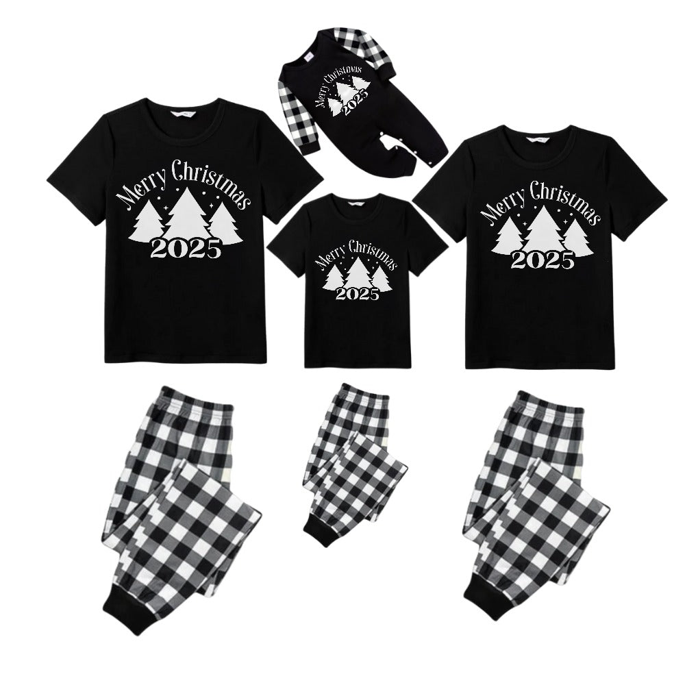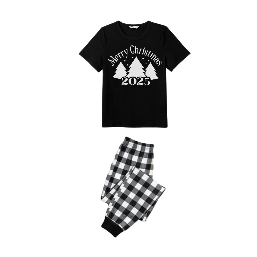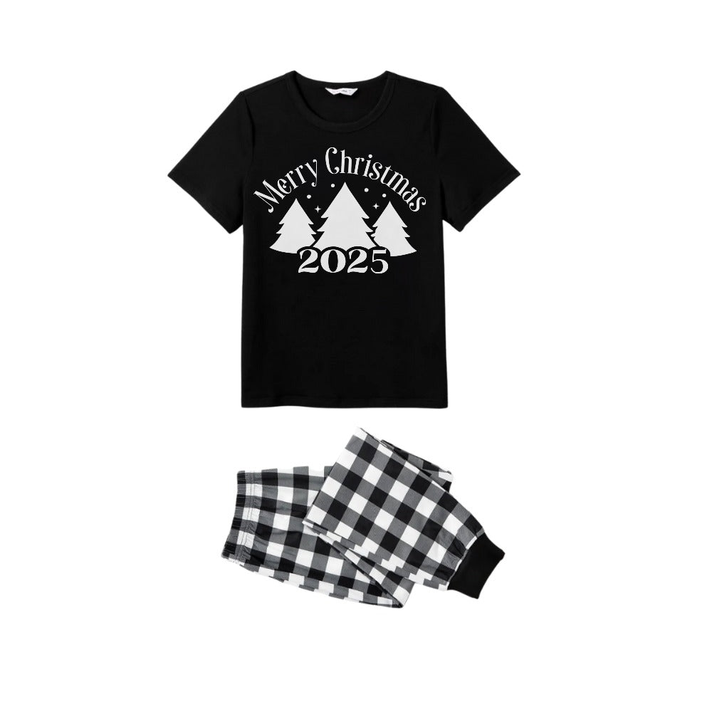 Black and White Plaid Short Sleeve Christmas Pajamas Set with Christmas Tree and Slogan Designs