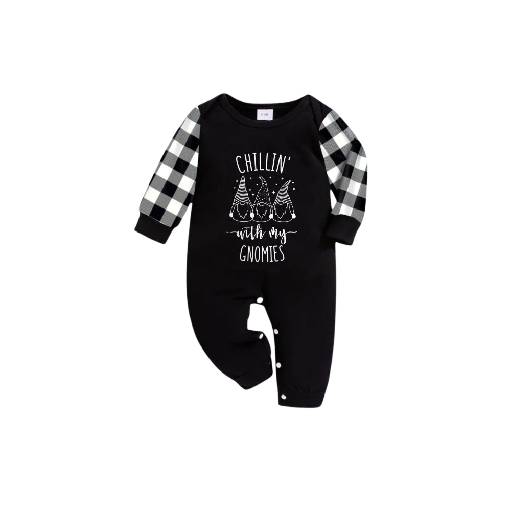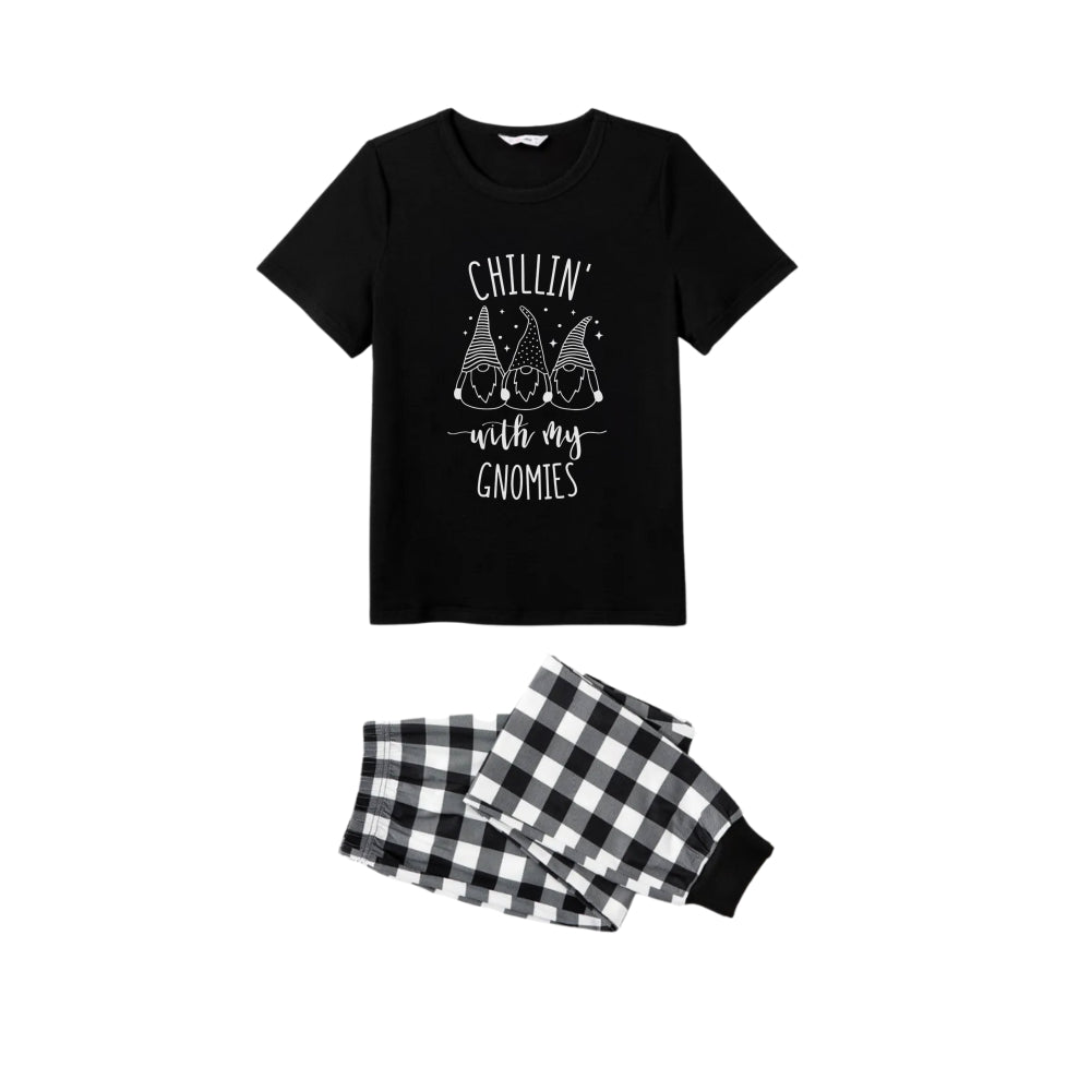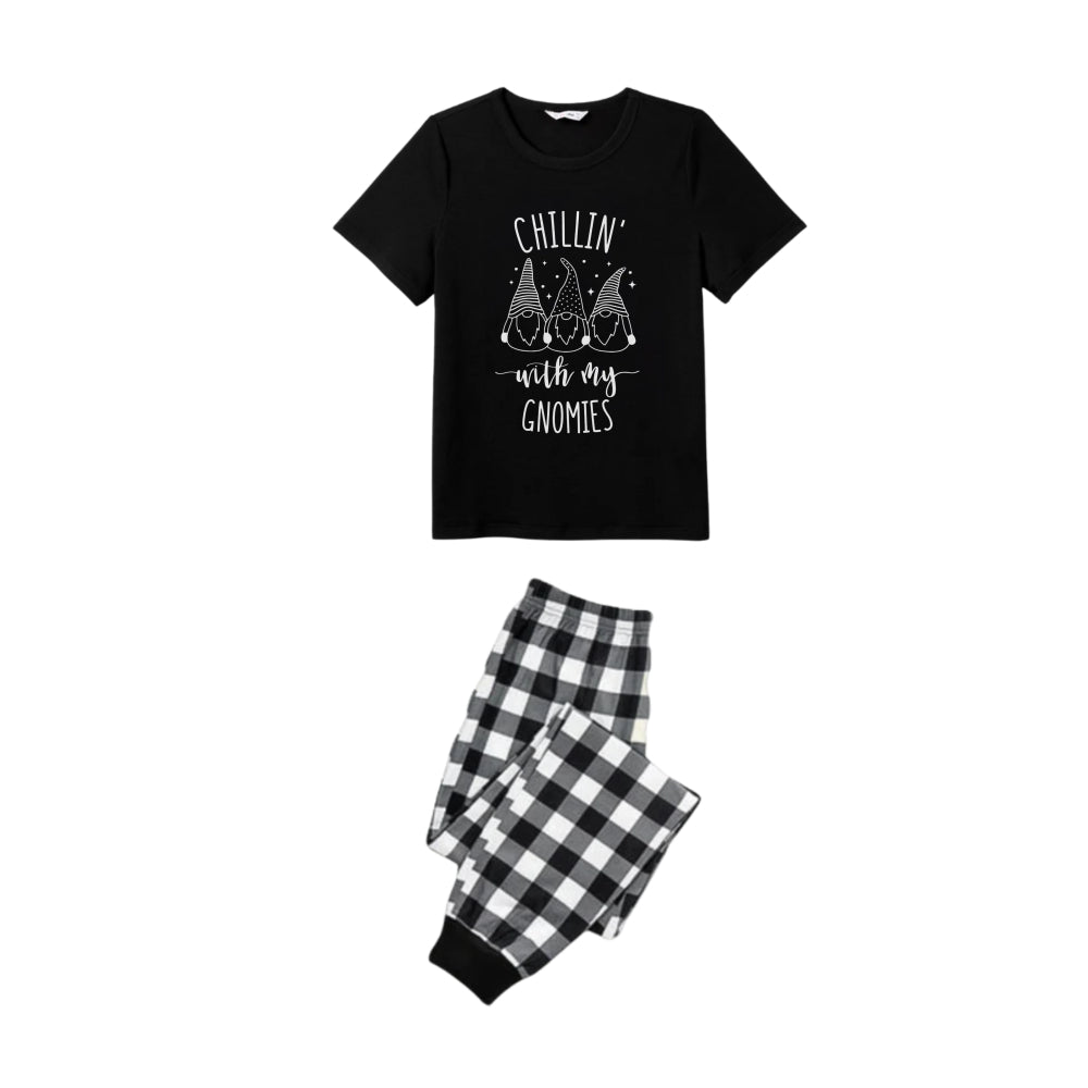 Black and White Plaid Short Sleeve Christmas Pajamas Set with Gnome and Humorous Holiday Text Prints