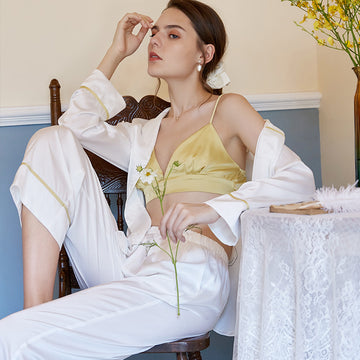 These luxurious pajamas in a timeless style will not only feel indulgent against your skin but also help you have a peaceful slumber too, Material: Silk-like charmeuse, This fabric feels silky against the skin for staying in, day or night. It's only fair to warn you, that you may never want to get dressed!