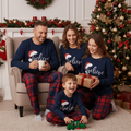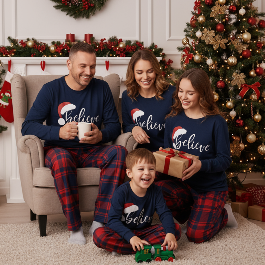 Christmas "Believe" Letter Print Blue Long Sleeve Top with Red & Blue Plaid Christmas Family Matching Pajamas