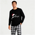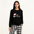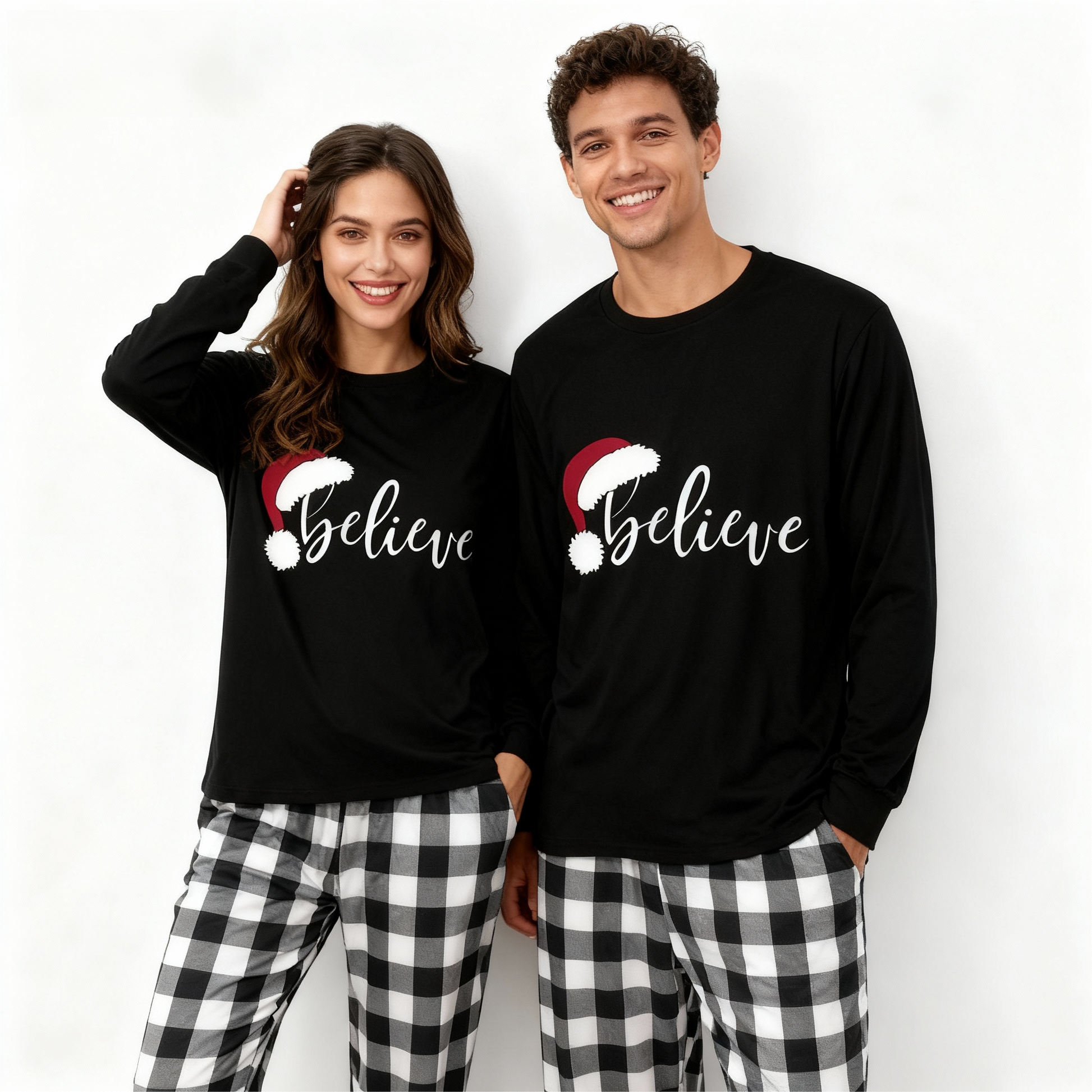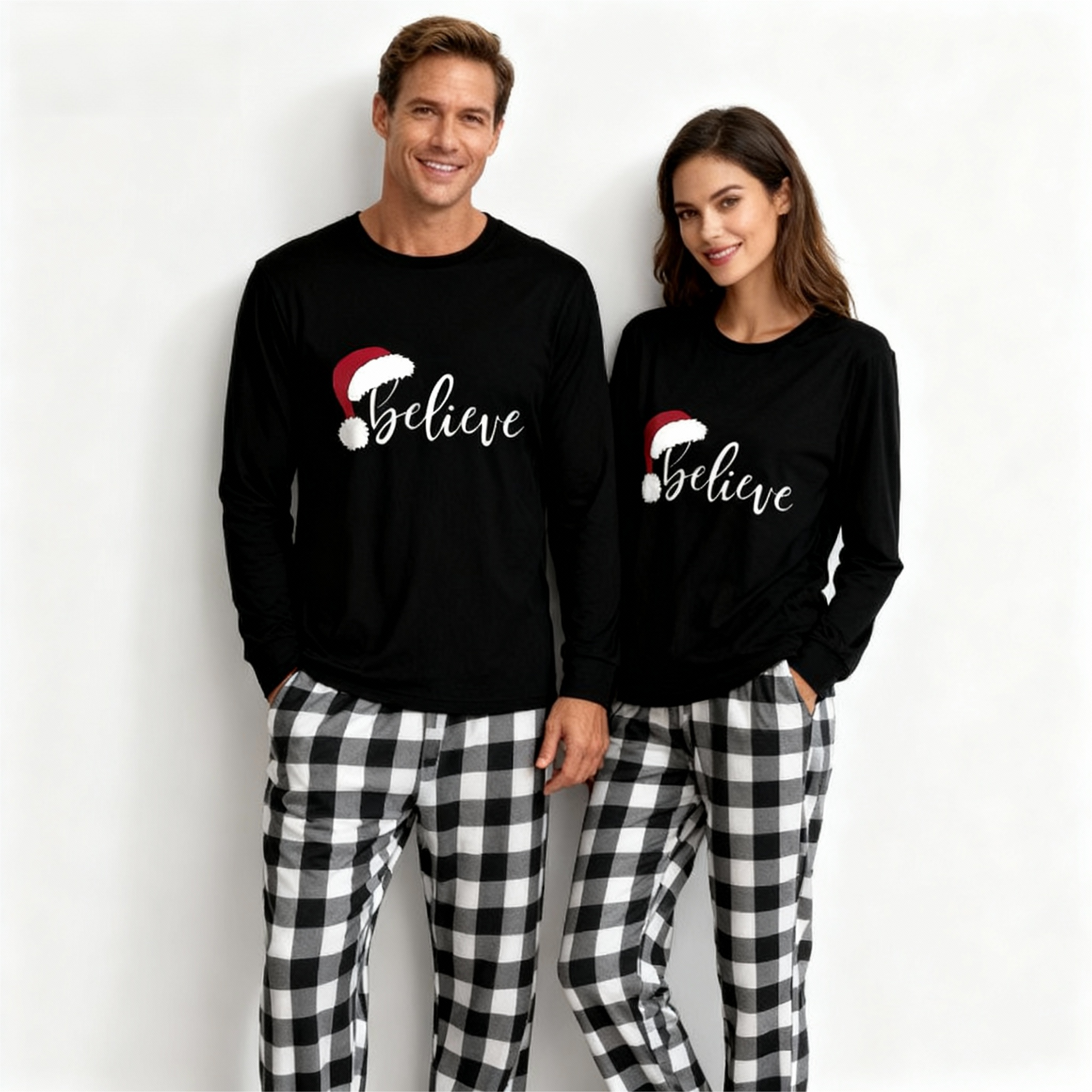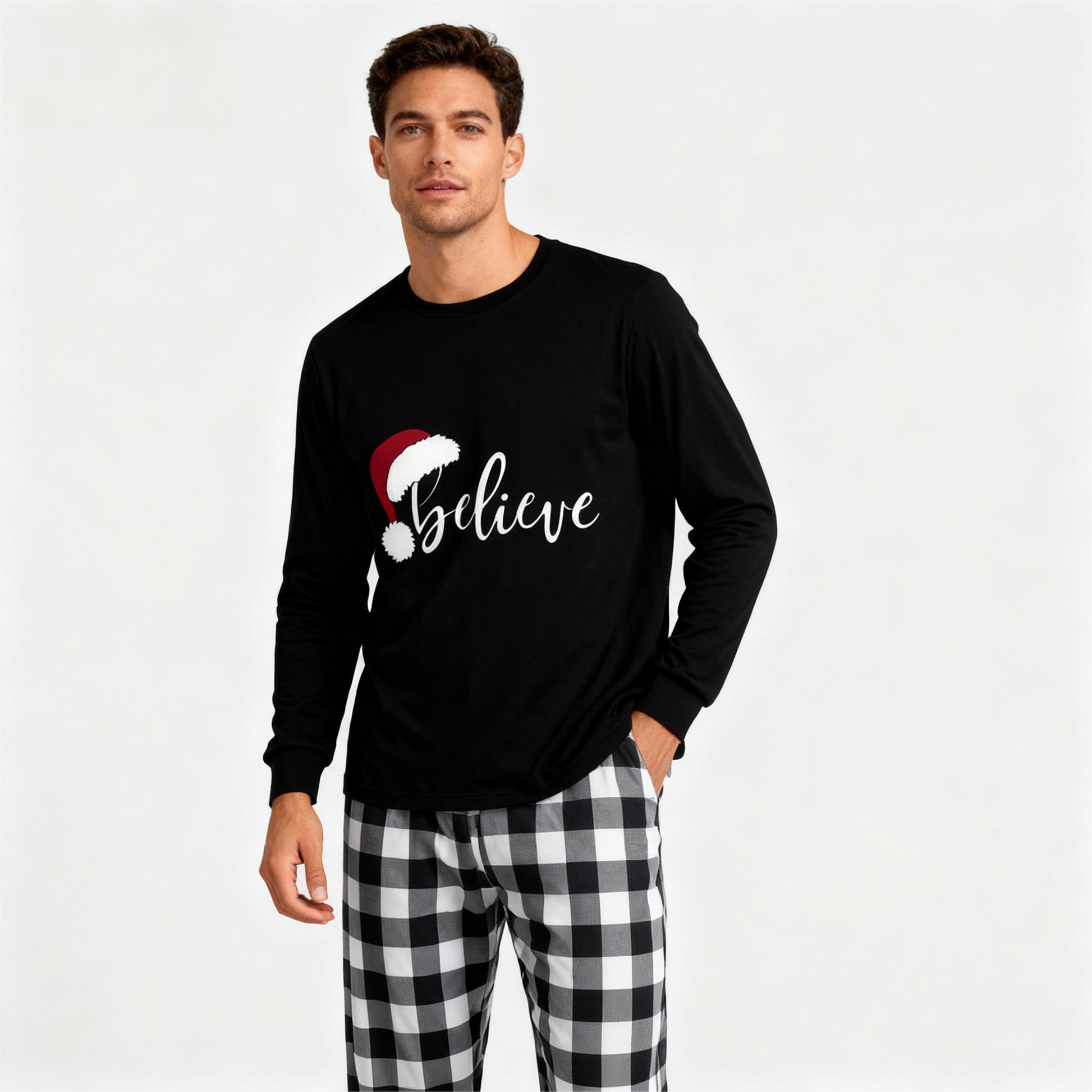 Christmas Hat and ‘Believe“ Letter Print Patterned Black & White Plaid Pajamas Set