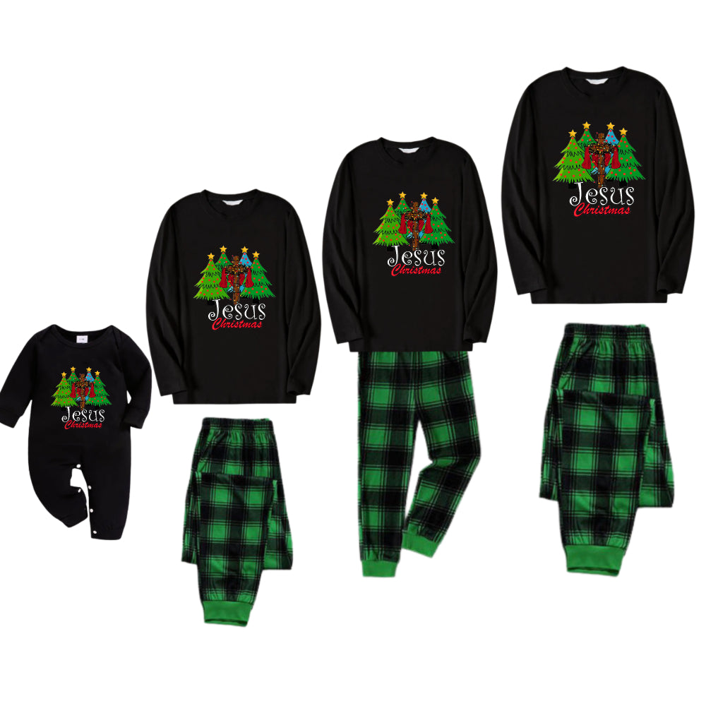 Christmas Family Matching Pajamas-Black Top and Green Plaid Pants Pjs Set with "Jesus Christmas" Print