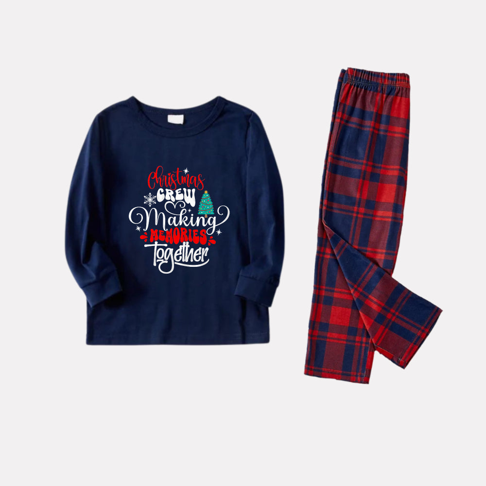 Christmas Family Matching Pajamas-Navy & Red Plaid Pjs Set with "Christmas Crew Making Memories Together" Slogan Print