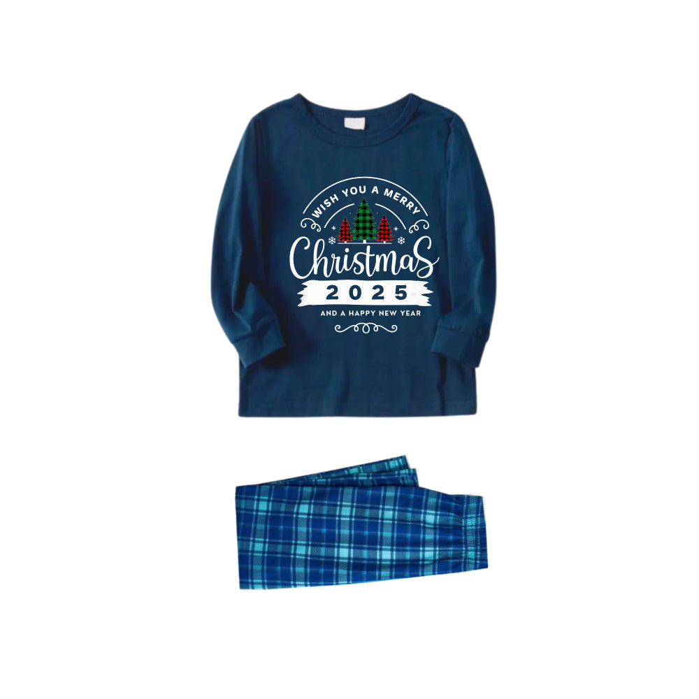 Christmas Family Matching Pajamas-Navy & Sky Blue Plaid Pjs Set with "Wish You A Merry Christmas 2025" Print